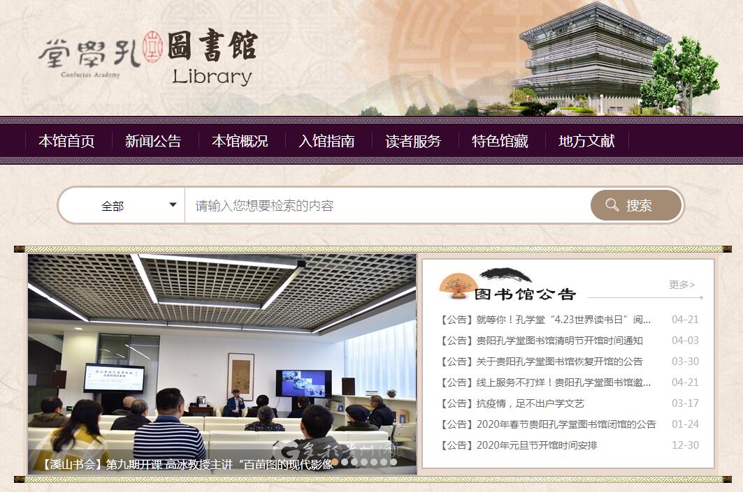 贵阳孔学堂图书馆坐落于花溪河畔的孔学堂中华文化国际研修园,东毗大成山,西邻花溪河,俯瞰十里河滩,建筑面积2581平方米,是一座集数字化、检索、展示、阅览、管理为一体,兼具人文教育、学术研究、文化传承、形象展示、社会服务等功能的专业图书馆。也是国内第一个全方位,多层次整合国学资源、阳明学资源的国学现代化图书馆。本馆馆藏资源是纸电文献并存。纸质图书主要包括研究性文献、阅读性文献及珍藏性文献三大类别。研究性文献主要包括古典文献(按经、史、子、集分类入藏)和研究专著(包括港台文献与外文文献),主要服务对象是相关领域的专家学者;阅读性文献主要包括:一、民国及以前大量幼学训蒙类教材和书籍(含港台类);二、儒学、历史、文学、艺术等领域的辅助读物;三、针对青少年的“六艺”类图书;珍藏性文献主要是地方文献(包括一些珍本、善本)及其相关外文文献。整个图书楼的功能布局为开放式格局。设有综合阅览区;电子阅览区;自主研修区;特藏文献区。馆内藏书实行开架借阅,每一层楼都设有数字化读者体验区,读者可通过“互动触摸”、“电子翻书”、“电子查询”、“云屏数字借阅机”、“kindle阅读器”等数字化多媒体设备,了解馆藏资源。数字化多媒体技术的运用,实现了网络资源的共享和馆内咨询服务的统一,为读者提供了方便快捷的检索服务。本馆基于互联网+数字阅读的云端平台,突破了实体图书馆的诸多限制。读者通过“云+端”模式,可实现“24 小时无障碍无边界立体式阅读”,真正实现了任何人在任何时间任何地点访问数字图书馆内任何内容的5A(Anyone、Anytime、Anywhere、Anyway、Any content)目标。读者除直接访问孔学堂数字图书馆专属网站进行在线数字阅读外,也可以通过手机客户端下载阅读,还可以通过馆内云屏数字借阅机扫描二维码之后借阅电子书刊。现有10万种电子图书、300多种电子报刊、3万集音频资源、20G国学讲堂、500,000分钟视频资源,18万集听书资源。内容涵盖诸子百家、宗教哲学、古典文学、历史、传统礼仪、传统艺术等。在数字资源建设方面,本馆依托大数据技术与国家骨干信息网络、教育专用网络等世界一流图书馆互联,汇聚多渠道、多类别的国学资源,并提供多途径的检索方式,实现题名、主题、著者、类型、年代等多维度查询检索,且具备分面聚类浏览功能。目前,所存储的国学数字资源已达11个TB,其中孔学堂本地中心机房存储量1TB,通过镜像、云端方式存储量10TB,已购买了9个商业数据库,自建了国学专题数据库,并网络大量相关免费资源链接的集成。同时以云平台为技术支撑,将内容丰富的国学资源图文并茂地呈现给读者,形成整合各类国学数字资源的专题资源库,和集海量检索、实时在线咨询、知识挖掘与分析、受众分析等多功能为一体的国学智慧云系统。在读者服务方面,我馆基于 “书香孔学堂”互联网+数字阅读平台的云端,为每位读者打造专属的“个人数字图书馆”。每位读者都可通过自己的“虚拟书房”从“书香孔学堂”平台提供的海量资源中,选取自己感兴趣的数字图书或其他资源放入自己的“个人数字图书馆”中,形成自己在网上独有的个性化图书馆。由于互联网不受地域限制的特点,使得多位国学爱好者之间实现实时互动,可将阅读、写作的经验和体会进行展示和交流。这就使“书香孔学堂”阅读平台形成一个巨大的网络阅读社区,不同读者们可以以书会友,随时分享阅读的收获和快乐,不仅摒弃了以往阅读纸书时难以分享的弊端,同时还通过互动社交化的数字阅读促进读者之间、社区之间、家庭之间的互动和交流,从而使国学阅读成为一种群体行为和社会现象。秉承 “古为今用,传承教化”的宗旨,为了进一步弘扬中华优秀传统文化、展示本土文化,倡导“天人合一、知行合一”的贵州人文精神,我馆正着力打造“国学(阳明‘心学’)”版块和“多彩贵州”特色民族文学版块,从而使孔学堂图书馆成为更具鲜明地方特色的国学图书馆。