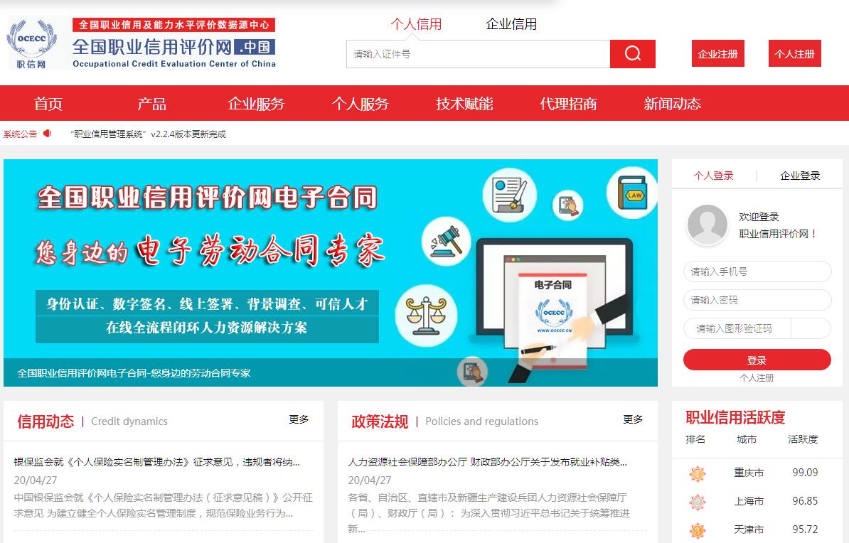全国职业信用评价网又称职业信用评价网,简称职信网。英文名称:Occupational credit evaluation center of China英文缩写:OCECC。网站域名:www.ocecc.cn。职信网是在2002年全国企业经营管理人才库和2006年国家专业人才库建设基础上创建的跨行业的人才职业信用评价工具类网站。创建初期植根于行业人力资源库开发,在国务院国资委职称评审和档案管理、教育部职业教育与成人教育、人社部职业技能鉴定和职工培训等业务上进行了广泛的、行业性的、系统性的数据采集、分析应用,得到了三部门的认可和支持。目前,职信网已服务部分行业及央企的职称评审、技能鉴定、岗位培训、职业信用等业务。在国家、地方相关部门和社会各界的支持下,正面向全国更广泛的领域进行推广和应用。职信网技术架构采用JAVA+有色人才私有云+公有云的混合云架构。通过较为先进的云计算方法能够保证系统在大规模运行时自动分配并合理使用计算资源,保障个人数据永不丢失和不被篡改。网站使用全球服务器证书技术加密访问, 利用数字证书(U盾)技术保障数据获取过程形成完整的电子证据链,是被司法部门直接采信信息。系统安全等级保护为三级,受公安系统监管。网站名称在公安部、工信部、政务和公益机构域名注册管理中心登记备案。全国职业信用评价网承载着推动职业信用体系建设的历史使命和行业期望,本着“守信者荣、失信者耻、无信者忧”的服务宗旨,紧紧围绕统筹推进“五位一体”总体布局和协调推进“四个全面”战略布局,不忘初心,牢记使命,甘于奉献。积极推动“互联网+人力资源”职业信用信息系统的统一建设,鼎力共筑开放融合、透明共享、公平职业、诚信自律的职业信用体系新生态,更好的为政府服务,为行业服务,为企业服务、为人才服务。为开创中国特色职业信用服务体系不懈奋斗。有色金属工业人才中心是全国职业信用评价网的运营主体,是OCECC.CN域名所有者。有色人才是国务院国资委主办的事业单位,在国内是为数不多集全部人力资源服务资质于一身的国务院所属部门人才服务机构,在人社部发布的《2017年国务院所属部门人才中介服务机构名录》中,有色人才排名第八。有色人才还是国务院国资委和数十家央企(行业协会)职称评审管理单位,拥有人社部职业技能鉴定中心授权、人社部职工教育培训授权、教育部教育教学指导委员会授权,同时还是发改委国家重大项目库成员单位。近年来人才中心深入探索信息化建设和互联网产品发展道线,先后投资3055万元建立了人力资源全业务流程信息管理系统、私有云计算中心和大数据算法研发中心。根据国务院《社会信用体系建设规划纲要(2014—2020年)》要求,人才中心于2014年报国资委立项建设行业人力资源库管理和评审系统,2015年批复建设;2016年1月,国家部委人才交流机构分会发起成立全国职业信用评价网;2016年4月,在广西柳州召开全国职业信用评价网启动仪式,职信网正式上线;2016-2017年网站平台找行业内试运行;2017年7月,市场化运营;2018年3月,中央财政投资行业人才评价系统,“职信网”重新架构符合互联网用户需求的职业信用2.0服务体系。