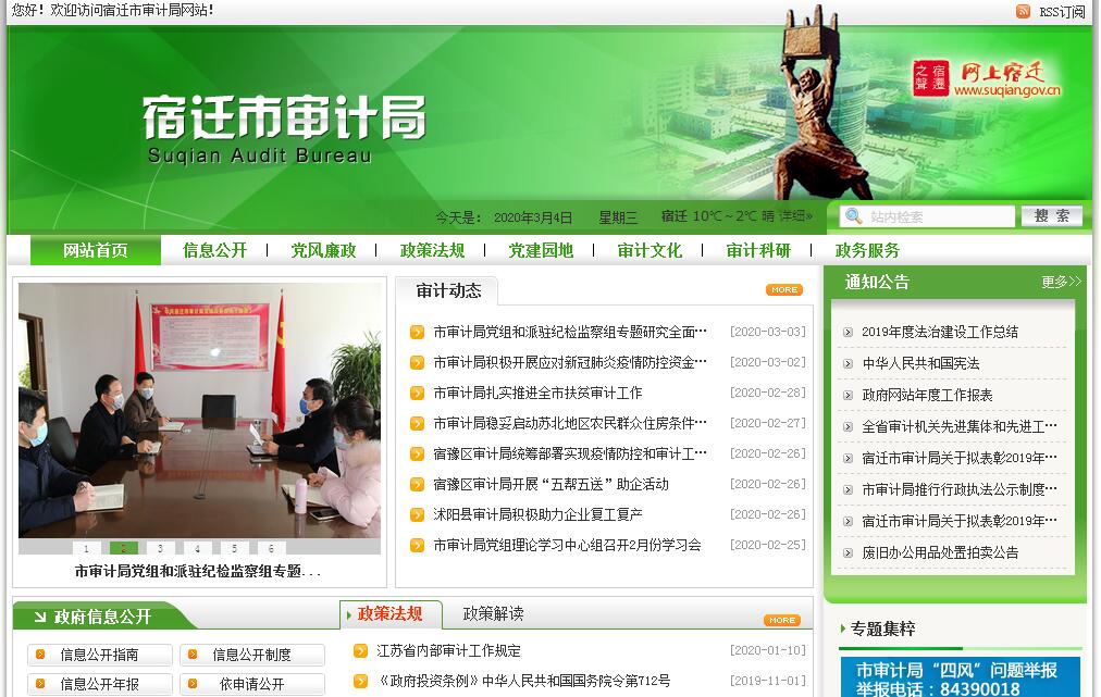宿迁市审计局是一个政府机构,管理范围为审计。其主要职责:(一)主管全市审计工作。贯彻执行国家审计方针政策和法律法规,参与起草审计、财政经济方面的规范性文件,提出相关建议。负责对市财政收支和法律、法规规定属于审计监督范围的财务收支的真实、合法和效益进行审计监督,维护财政经济秩序,提高财政资金使用效益,促进廉政建设,保障全市经济和社会健康发展。对审计、专项审计调查和核查社会审计机构相关审计报告的结果承担责任,并负有督促被审计单位整改的责任。(二)制定并组织实施审计工作发展规划和专业领域审计工作规划,制定并组织实施年度审计计划,对直接审计、调查和核查的事项依法进行审计评价,做出审计决定或提出审计建议。(三)向市政府和省审计厅提出年度市级预算执行和其他财政收支情况的审计结果报告。受市政府委托向市人大常委会提出市级预算执行和其他财政收支情况的审计工作报告、审计发现问题的纠正和处理结果报告。向市政府和省审计厅报告对其他事项的审计与专项审计调查情况及结果。依法向社会公布审计结果。向市政府有关部门和所辖县(区)政府通报审计情况及审计结果。(四)直接审计下列事项,出具审计报告,在法定职权范围内做出审计决定或向有关主管机关提出处理处罚的建议:1.市级预算执行情况和其他财政收支,市直各部门(含直属单位)预算的执行情况、决算和其他财政收支。2.所辖县(区)政府预算的执行情况、决算和其他财政收支,省、市级财政转移支付资金。3.使用市级财政资金的事业单位和社会团体的财务收支。4.市级政府投资和以市级政府投资为主的建设项目的预算执行情况及决算。5.市属国有企业和金融机构、市政府规定的市属国有资本占控股或主导地位的企业和金融机构的资产、负债及损益。6.市政府部门、所辖县(区)政府管理和其他单位受市政府及其部门委托管理的社会保障基金、社会捐赠资金及其他有关基金、资金的财务收支。7.根据审计署授权,对国际组织和外国政府援助、贷款项目的财务收支进行审计监督;根据省审计厅授权,对省驻宿单位财政财务收支、省政府投资和以省级政府投资为主的建设项目的预算执行情况及决算等其他事项。8.法律、行政法规和地方性法规规定应由市审计局审计的其他事项。(五)按规定对市管领导干部及依法属于市审计局审计监督对象的其他单位主要负责人实施经济责任审计。(六)组织实施对国家财经法律、法规、规章、政策和宏观调控措施执行情况、财政预算管理或国有资产管理使用等与国家和省、市财政收支有关的特定事项进行专项审计调查。(七)依法检查审计决定执行情况,督促纠正和处理审计发现的问题,依法办理被审计单位对审计决定提请行政复议、行政诉讼或市政府裁决中的有关事项。协助配合有关部门查处相关重大案件。(八)指导和监督内部审计工作,核查社会审计机构对依法属于审计监督对象的单位出具的相关审计报告。(九)与所辖县(区)政府共同领导所辖县(区)审计机关。依法领导和监督下级审计机关的业务,组织下级审计机关实施特定项目的专项审计或审计调查,纠正或责成纠正下级审计机关违反国家规定做出的审计决定。按照干部管理权限协管所辖县(区)审计机关负责人。(十)指导和推广信息技术在全市审计领域的应用,组织建设全市审计信息系统。(十一)承办市政府和审计署、省审计厅交办的其他事项。