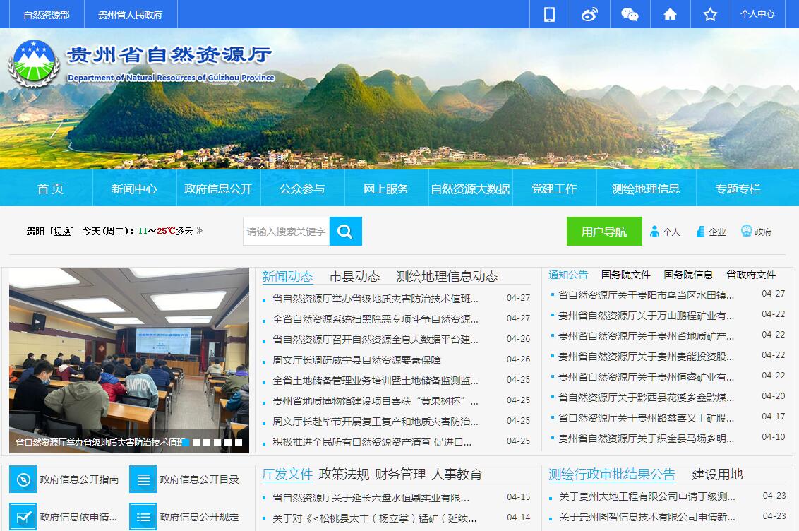 贵州省自然资源厅(以下简称省自然资源厅)是省人民政府组成部门,为正厅级。贵州省自然资源厅贯彻落实党中央、省委关于自然资源工作的方针政策和决策部署,在履行职责过程中坚持和加强党对自然资源工作的集中统一领导。贵州省自然资源厅主要职责是:(一)履行全民所有土地、矿产、森林、草原、湿地、水等自然资源资产所有者职责和所有国土空间用途管制职责。拟订自然资源和国土空间规划及测绘等法规规章草案,拟订相关政策并监督检查执行情况。(二)负责自然资源调查监测评价。贯彻自然资源调查监测评价的指标体系和统计标准,执行自然资源调查监测评价制度。实施自然资源基础调查、专项调查和监测。负责自然资源调查监测评价成果的监督管理和信息发布。指导全省自然资源调查监测评价工作。(三)负责自然资源统一确权登记工作。贯彻执行各类自然资源和不动产统一确权登记、权籍调查、不动产测绘、争议调处、成果应用的制度、标准、规范,拟订相关政策并组织实施。建立健全全省统一的自然资源和不动产登记信息管理平台。负责自然资源和不动产登记资料收集、整理、共享、汇交管理等。指导监督全省自然资源和不动产确权登记工作。(四)负责自然资源资产有偿使用工作。建立全民所有自然资源资产统计制度,负责全民所有自然资源资产核算。编制全民所有自然资源资产负债表,执行考核标准。拟订全民所有自然资源资产划拨、出让、租赁、作价出资和土地储备政策并监督实施,合理配置全民所有自然资源资产。负责自然资源资产价值评估管理,依法收缴相关资产收益。(五)负责自然资源的合理开发利用。贯彻执行国家自然资源发展规划,组织拟订全省自然资源发展规划,执行自然资源开发利用标准,实施政府公示自然资源价格体系制度,组织开展自然资源分等定级价格评估,开展自然资源利用评价考核,指导节约集约利用。负责自然资源市场监管。组织研究自然资源管理涉及宏观调控、区域协调和城乡统筹的政策措施。(六)负责建立全省空间规划体系并监督实施。牵头编制主体功能区规划并组织实施,组织编制并监督实施国土空间规划和相关专项规划。开展国土空间开发适宜性评价,建立国土空间规划实施监测、评估和预警体系。组织划定生态保护红线、永久基本农田、城镇开发边界等控制线,构建节约资源和保护环境的生产、生活、生态空间布局。实施国土空间用途管制制度,研究拟订城乡规划政策并监督实施。组织拟订并实施土地等自然资源年度利用计划。负责土地等国土空间用途转用工作。负责土地征收征用管理。(七)负责统筹全省国土空间生态修复。牵头组织编制国土空间生态修复规划并实施有关生态修复重要工程。负责国土空间综合整治、土地整理复垦、矿山地质环境恢复治理等工作。牵头拟订生态补偿制度并组织实施,制定合理利用社会资金进行生态修复的政策措施,提出重要备选项目。(八)负责组织实施最严格的耕地保护制度。拟订耕地保护政策,负责耕地数量、质量、生态保护。组织实施耕地保护责任目标考核和永久基本农田特殊保护。实施耕地占补平衡制度,监督占用耕地补偿制度执行情况。(九)负责管理地质勘查行业和地质工作。编制地质勘查规划并监督检查执行情况。管理省级地质勘查项目。组织实施省级地质矿产勘查专项。负责地质灾害预防和治理,监督管理地下水过量开采及引发的地面沉降等地质问题。负责古生物化石的监督管理。(十)负责落实综合防灾减灾规划相关要求,组织编制全省地质灾害防治规划并指导实施,执行国家防护标准。组织指导协调和监督地质灾害调查评价及隐患的普查、详查、排查。指导开展群测群防、专业监测和预报预警等工作,指导开展地质灾害工程治理工作。承担地质灾害应急救援的技术支撑工作。(十一)负责矿产资源管理工作。负责矿产资源储量管理及压覆矿产资源审批。负责矿业权管理。会同有关部门承担保护性开采的特定矿种、优势矿产的调控及相关管理工作。监督指导矿产资源合理利用和保护。(十二)负责测绘地理信息管理工作。负责基础测绘和测绘行业管理。负责测绘资质资格与信用管理,监督管理地理信息安全和市场秩序。负责地理信息公共服务管理。负责测量标志保护。(十三)推动自然资源领域科技发展。根据自然资源领域科技创新发展和人才培养战略,拟订并实施相关规划和计划。组织编制并监督实施技术标准、规程规范。组织实施重要科技工程及创新能力建设,推进自然资源信息化和信息资料的公共服务。按规定做好大数据发展应用和政务数据资源管理相关工作,依法促进部门政务数据资源规范管理、共享和开放。(十四)开展自然资源对外交流合作。承担自然资源领域对外交流合作工作和涉外行政许可相关工作。(十五)根据授权对地方政府落实党中央、国务院和省委、省政府关于自然资源和国土空间规划的重大方针政策、决策部署及法律法规执行情况进行督察。查处自然资源开发利用和国土空间规划及测绘重大违法案件。指导地方有关行政执法工作。(十六)结合部门职责,做好军民融合、扶贫开发等相关工作;负责本部门、本行业领域的安全生产和消防安全工作。(十七)统一领导和管理省林业局。(十八)完成