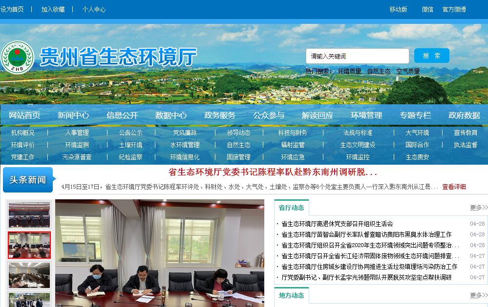 贵州省生态环境厅主要职责:(一)全面贯彻落实生态环境基本制度。会同有关部门拟订全省生态环境政策、规划并组织实施,起草地方性生态环境法规、规章草案。会同有关部门编制并监督实施重点区域、流域、饮用水水源地生态环境规划和水功能区划;贯彻生态环境标准、生态环境技术规范。(二)负责重大生态环境问题的统筹协调和监督管理。牵头协调重特大环境污染事故和生态破坏事件的调查处理,指导协调市县政府对重特大突发生态环境事件的应急、预警工作,牵头指导实施生态环境损害赔偿制度,协调解决有关跨区域环境污染纠纷,统筹协调全省重点区域、流域生态环境保护工作。(三)负责监督管理全省减排目标的落实。组织制定贯彻各类污染物排放总量控制、排污许可证制度的措施并监督实施,确定大气、水等纳污能力,提出贯彻实施总量控制的污染物名称和控制指标,监督检查各地污染物减排任务完成情况,实施生态环境保护目标责任制。(四)负责提出生态环境领域固定资产投资规模和方向,省财政性资金安排的意见,按规定权限审批、核准规划内和年度计划规模内固定资产投资项目,配合有关部门做好组织实施和监督工作。参与指导推动循环经济和生态保护产业发展。(五)负责环境污染防治的监督管理。制定贯彻大气、水、土壤、噪声、光、恶臭、固体废物、化学品、机动车等污染防治管理制度的措施并监督实施。会同有关部门监督管理饮用水水源地生态环境保护工作,组织指导城乡生态环境综合整治工作,监督指导农业面源污染治理工作。监督、管理、指导区域大气环境保护工作,组织实施区域大气污染联防联控协作机制。(六)指导,协调和监督生态保护修复工作。组织编制生态保护规划,监督对生态环境有影响的自然资源开发利用活动、重要生态环境建设和生态破坏恢复工作。组织制定各类自然保护地生态环境监管制度并监督执法。监督野生动植物保护、湿地生态环境保护、荒漠化防治等工作。指导协调和监督农村生态环境保护,监督生物技术环境安全,牵头生物物种(含遗传资源)工作,组织协调生物多样性保护工作,参与生态保护补偿工作。(七)负责核与辐射安全的监督管理。拟定贯彻有关政策、规划、标准的措施,牵头负责核安全工作协调机制有关工作,参与核事故应急处理,负责辐射环境事故应急处理工作。监督管理核设施与放射源安全,监督管理核设施、核技术应用、电磁辐射、伴有放射性矿产资源开发利用中的污染防治。(八)负责生态环境准入的监督管理。受省政府委托对重大经济和技术政策、发展规划以及重大经济开发计划进行环境影响评价。按规定承担重大开发建设区域、规划、项目环境影响评价相关工作。拟订并组织实施生态环境准入清单。(九)负责生态环境监测工作。制定贯彻生态环境监测制度和规范、相关标准的措施并监督实施。会同有关部门统一规划生态环境质量监测站点设置,组织实施生态环境质量监测、污染源监督性监测、温室气体减排监测、应急监测。组织对生态环境质量状况进行调查评价、预警预测,组织承建和管理生态环境监测网和生态环境信息网,推动生态环境大数据建设。实行生态环境质量公告制度,统一发布全省生态环境综合性报告和重大生态环境信息。(十)负责应对气候变化工作。组织拟订贯彻应对气候变化及温室气体减排重大战略、规划和政策的措施,综合协调应对气候变化相关工作。(十一)负责生态环境监察工作。经省政府授权,对全省市县两级政府及相关部门环境保护法律法规、标准、政策、规划执行情况,一岗双责落实情况,以及环境质量责任落实情况进行监督检查。建立健全生态环境保护督察制度,协调、配合中央生态环境保护督察工作,组织开展全省生态环境保护监察工作,根据授权对各地区各有关部门贯彻落实中央、省生态环境保护决策部署情况进行督察问责。(十二)统一负责生态环境监督执法。组织开展全省生态环境保护执法检查活动,查处重大生态环境违法问题。指导全省生态环境保护综合执法队伍建设和业务工作。(十三)组织指导和协调生态环境宣传教育工作,制定并组织实施生态环境保护宣传教育纲要,推动社会组织和公众参与的生态环境保护。开展生态环境科技工作,组织生态环境重大科学研究和技术工程示范,推动生态环境技术管理体制建设。(十四)承担生态环境国际合作交流工作。组织协调承担有关生态环境国际条约的省内履约工作,参与处理涉外生态环境事务。(十五)结合部门的职责,做好军民融合、扶贫开发等相关工作;加大科技投入,提高科技创新能力,为推进创新驱动发展提供保障;负责本部门、本行业领域的安全生产和消防安全工作;按规定做好大数据发展应用和政务数据资源管理相关工作,依法促进部门政务数据资源规范管理、共享和开放。(十六)完成省委、省政府和生态环境部交办的其他任务。