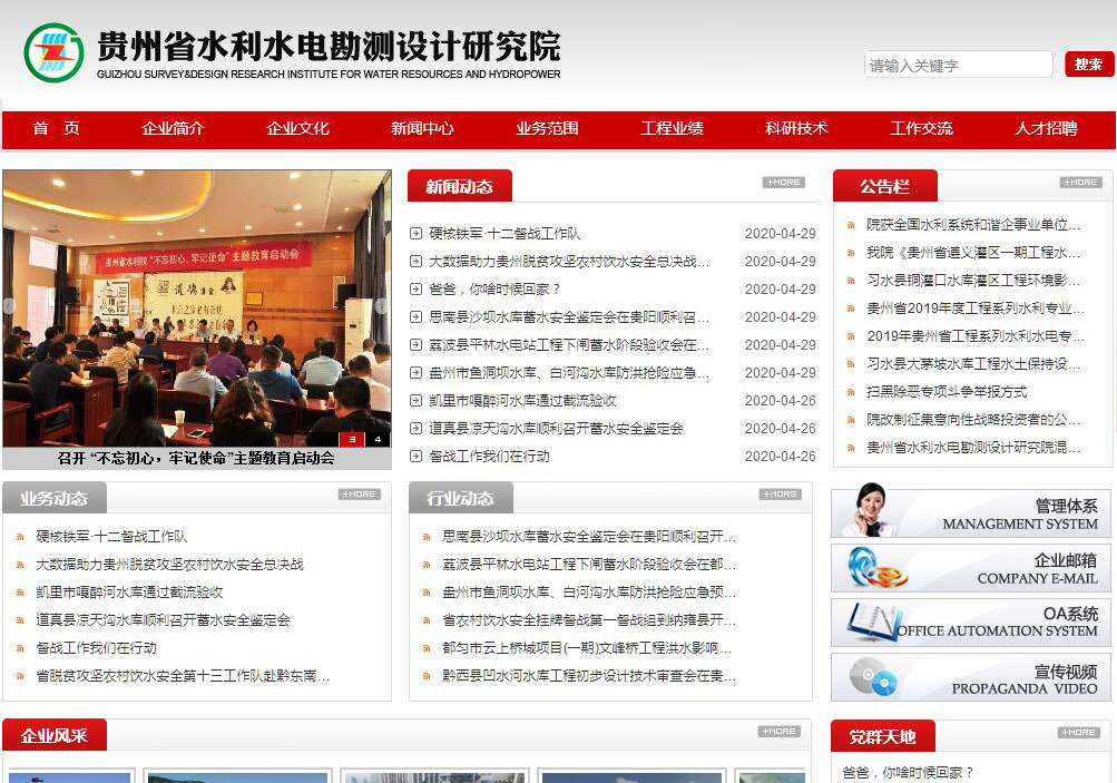 贵州省水利水电勘测设计研究院始建于1958年,隶属于贵州省水利厅,系持有国家相关部委颁发的多项甲级资质的综合性咨询、勘察设计单位。主要资质包括综合类勘察、工程测绘、水利水电工程咨询及设计、科研试验、地质灾害评估、水资源论证、水文水资源调查评价、水土保持方案编制、生态建设及环境工程咨询、市政公用工程咨询、岩土工程咨询等甲级资质;环境影响评价、建筑工程设计等乙级资质;以及总承包甲级资质和贵州省第一批工程项目管理企业;1996年经国家外经部批准开展国际技术经济合作业务,具有对外承包经营资格。我院现有职工600余人,其中专业技术人员414人,工程技术应用研究员15人,高级专业技术人员157人,中级184人,各类注册执业资格人员147人次;突出贡献的中青年科学技术专家2人,享受国务院特殊津贴专家5人,省管专家3人。经过多年的人才队伍建设,现已经拥有一批工程经验丰富的规划、咨询、勘察、设计人才。建院50多年来,我院奉行“团结求实、开拓创新”的企业精神,先后承担了国内外大、中、小型水利、水电、工业与民用建筑、交通、市政、农业等行业规划、咨询、勘察、设计项目1400余项,承担的全省水资源综合规划、地下水利用与保护规划、农村饮水安全规划、山洪灾害防治规划、烟水配套工程规划、人均半亩口粮田规划等规划项目,以及完成的黔中水利枢纽一期工程、“滋黔一期”、“滋黔二期”等一批大中型骨干水利工程的咨询、勘测设计,为有效解决贵州民生水利、工程性缺水难题等提供科学的决策依据;在对外交流过程中,我院曾派专家前往奥地利、津巴布韦、荷兰、博茨瓦纳、越南、印度尼西亚、斯里兰卡、印度、巴基斯坦等国家,在水利水电方面进行交流并提供技术咨询服务。1997年以来,我院依托自身优势,积极开拓以设计为龙头的总承包业务,到目前完成总承包和项目管理项目30余项,业务形成了“一业为主、多头延伸”的经营格局。改革开放以来,我院共获得各类科技奖项数近200余项,其中科技进步、优秀勘察设计及咨询等奖项151项,国家级4项,省部级38项。长期工作实践中,我院在拱坝技术、岩溶地区地下工程、成库条件勘察评价及防渗处理技术、高水头电站及高杨程泵站技术、中小流域水电梯级开发、山区水资源开发利用与配置技术等方面积累了丰富的经验;在筑坝技术方面,从传统的砌石拱坝发展到外掺氧化镁筑坝、碾压混凝土坝等坝型的设计研究上,我院取得了一定的突破和创新。推广实施的拱坝外掺氧化镁微膨胀混凝土快速筑坝在三江水库、老江底电站等工程中得到有效利用,大大缩短了施工工期,目前是国内掌握此项技术的少数设计院之一,处于国际领先水平。近年来,我院在基层党组织以及精神文明建设方面取得很大进步,分别被中央组织部授予“全国先进基层党组织”、中央精神文明建设指导委员会授予“全国精神文明建设工作先进单位” 人力资源和社会保障部和国家发改委授予“国家西部大开发突出贡献集体”、贵州省委授予“五好基层党组织”等光荣称号。随着国家西部大开发战略继续实施,根据贵州以交通和水利为重点的基础设施建设战略部署,为切实解决贵州工程性缺水问题,贵州水利建设将迎来跨越发展的历史机遇,我院愿与各界同仁一道,抢抓机遇,开拓创新,共创现代水利水电事业美好的明天。