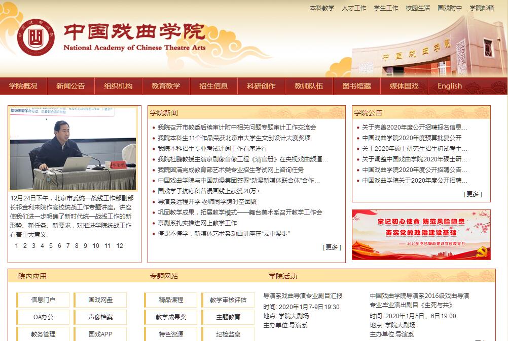 中国戏曲学院是中国唯一一所独立建制的培养戏曲艺术高级专门人才的院校,是中国戏曲教育的最高学府,在国内戏曲教育领域中,专业最完备、培养体系最健全、优质师资最集中、输送高端专业人才最多、业内影响最大,在全国戏曲教育领域中起到引领示范作用,是全国“戏曲特色鲜明、国内水准一流、国际影响广泛”的高水平特色大学,被誉为“中国高端戏曲人才培养的摇篮”。学院成立于1950年1月,是新中国由国家举办的第一所戏曲教育机构,首任校长是中华人民共和国国歌词作者田汉先生。校训是“德艺双馨,继往开来”。学院原隶属文化部,最初称文化部戏曲改进局戏曲实验学校,1955年1月正式定名为中国戏曲学校。1978年10月经国务院批准改制为中国戏曲学院,并招收第一届本科生。2000年学院划转北京市,2014年,文化和旅游部和北京市人民政府共建中国戏曲学院。学院现有“戏剧与影视学”、“音乐与舞蹈学”、“艺术学理论”3个一级学科硕士点及14个专业、28个本科专业方向,戏剧戏曲学为北京市重点学科。京剧表演专业是学院的传统优势专业、国家和北京市两级特色专业、北京市属高校首批一流专业。学院目前设有京剧系、表演系、导演系、音乐系、戏曲文学系、舞台美术系、新媒体艺术系、国际文化交流系、思想政治理论课教学部、体育部、继续教育部等教学单位,下设附中,形成了包括戏曲中等教育、本科教育、研究生教育、继续教育、留学生教育等在内的层次基本齐备、具有鲜明“国戏”特色的戏曲人才培养格局。建校以来,学院汲取以“富连成”等为代表的传统科班人才培养传统,顺应现代艺术教育的趋势,始终以继承弘扬民族传统优秀文化为己任,形成了“教学、实践、科研、创作”四位一体的人才培养模式,培养了大批戏曲艺术精英,涌现出刘秀荣、谢锐青、孙岳、朱秉谦、钱浩梁、杨少春、张春孝、李鸣岩、袁国林、侯正仁、杨秋玲、俞大陆、王晶华、王梦云、吴钰璋、马名骏、刘长瑜、冯志孝、李长春、寇春华、郑岩、李光、李玉声、叶少兰、李欣、高牧坤、沈健瑾、李维康、耿其昌、郑子茹、陈淑芳、杨凤一、刘子蔚、李宏图、于魁智、杜镇杰、李军、侯丹梅、孟广禄、王润菁、王蓉蓉、周龙、董圆圆、赵永伟、袁慧琴、王平、江其虎、杨少鹏、谭正岩、王璐、张建峰、杜喆、窦晓璇、詹磊等一大批优秀表演人才。学院先后承办了六届“中国京剧优秀青年演员研究生班”,张火丁、李胜素、迟小秋、张建国、张克、奚中路、王立军、杨赤、史依弘、沈铁梅、曾昭娟等229名毕业生已经成为当今全国重点戏曲院团的领军人物。建校之初,就汇集了一批新文化工作者和传统科班著名教师,聘请了王瑶卿、萧长华、王凤卿、尚和玉、谭小培、张德俊、金仲仁、鲍吉祥、马德成等教授和“四大名旦”梅兰芳、尚小云、程砚秋、荀慧生来校授课,奠定了优良的育人传统,为中国戏曲学院教育发展打下了坚实的基础。目前,学院延聘全国戏剧戏曲界各专业、各剧种百余位戏曲表演艺术家、理论家为学院荣誉教授、客座教授,已经形成了一支师德高尚、业务精湛、结构合理、充满活力、新老结合、院内外结合、在职与客座结合的师资队伍,被誉为全国戏曲人才培养的“国家队”。学院学术研究体系日趋完善。学院为北京戏曲文化传承与发展研究基地、首批中国文艺评论基地,北京高校中国特色社会主义理论研究协同创新中心协同单位。设有中国戏曲音乐学会、中国戏曲导演学会两个国家一级学会,还拥有包括戏曲研究所、京剧研究所、梅兰芳艺术研究中心、张火丁程派艺术传承中心等学术研究平台。召开京剧学国际研讨会,推出了一大批高水准的研究成果,在业界产生了广泛学术影响,为建构和完善中国戏曲理论体系奠定了坚实的基础。以艺术实践和创作推动教学建设,是学院办学的优良传统,也是学院人才培养的特色。学院积极参与重大艺术创作,主动参与各级优秀戏曲剧本创作扶持和优秀经典戏曲剧目影视创作,创排了《白蛇传》《穆桂英大战洪州》《卖水》《对花枪》《岳云》《杜十娘》《悲惨世界》《哪吒》《梅兰霓裳》《梁祝》等一批批具有民族性、时代性以及学院风格的优秀作品。作为行业教育的领军者,学院主动履行大学责任,承担国家使命。学院承办由中宣部、文化和旅游部主办的体现国家文化价值导向的“新年戏曲晚会”,习近平总书记及中央领导参加。学院承办文化和旅游部“梨花杯”全国青少年戏曲教育教学成果展示活动、 “十三五”期间戏曲艺术人才培养“千人计划”及“名家传戏——当代戏曲名家收徒传艺工程”等各项重大活动。学院倡议成立“中国戏曲教育联盟”,团结全国戏曲人才培养单位抱团发展,强化了戏曲人才培养的纵向链条。学院一直承担着向海外传播中华戏曲文化的重要使命。积极探索戏曲文化国际传播与交流的有效模式,搭建戏曲推介展示平台。用戏曲形式改编演绎国际经典剧目;依托孔院开展的系列戏曲巡讲、巡展、巡演等。学院与美国宾汉顿大学共同建立了全球第一家戏曲孔子学院,培养了各国学生千余名,多次参加各类国际艺术节演出活动,在海内外产生了广泛影响。作为高水平特色大学,学院在戏曲人才培养、戏曲科研与创作、公共服务、文化传承与国