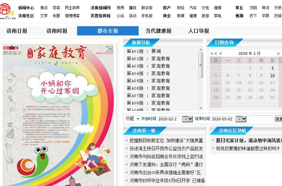 | 网站简介: 都市女报电子版,都市女报多媒体数字报。《都市女报》是一张关注女性为特色的综合性都市报。2001年9月24日创刊,每周五期,每期48版,采用双面彩色印刷,隶属于济南日报报业集团。都市女报面向都市中青年男女,打造都市生活,追求时尚风格,领导消费潮流。都市女报突出女性视角,强调女性特色,彰显实用时尚内容,为都市现代生活提供有效服务。都市女报立足济南,面向山东,辐射全国。都市女报愿以100分的努力来换取读者的一分青睐。都市女报宗旨:揭示女性世界,探讨两性话题,引导时沿潮流服务千家万户。都市女报信念:只有想不到,没有做不到。都市女报目标:打造品位,追求卓越,超凡脱俗与众不同。 |