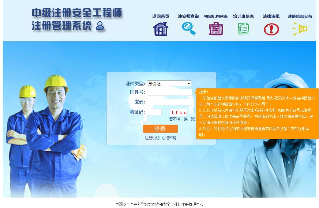 | 网站简介: 注册安全工程师注册管理系统由中国安全生产科学研究院注册安全工程师注册管理中心主办。 |