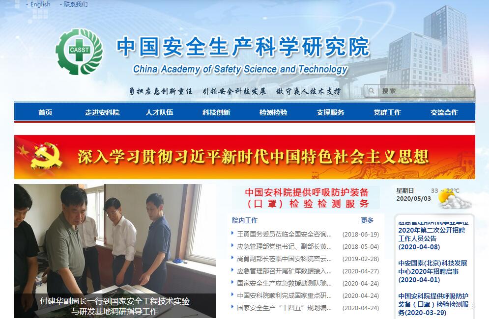 中国安全生产科学研究院是应急管理部直属的综合性和社会公益性科研事业单位。其前身是成立于1980年、隶属于国家劳动总局的劳动保护科学研究所,随着历次机构改革,先后由劳动部、国家经贸委、国家安全生产监督管理局、国家安全生产监督管理总局、应急管理部领导,2004年9月由中编办批准正式更名为中国安全生产科学研究院(以下简称中国安科院)。中国安科院以实施科技兴安战略,推动安全生产科技进步和科技创新为宗旨;以开展安全领域基础性、综合性、前瞻性科学研究和解决重大事故预防、监控、预警和应急救援等重大技术关键问题为主要方向;为政府安全生产监管工作提供全面支撑,为企业安全生产、职业健康、应急管理和重点工程项目安全提供技术服务,开展安全科学技术学术交流,培养安全生产领域优秀人才。中国安科院现有职工400余人,其中博士59人、硕士135人,高级技术职称人员139人。在科研人员中,4人入选新世纪百千万人才国家级人选,5人享受政府特殊津贴,1人获得中国青年科技奖,2人入选中青年科技创新领军人才,1人获得全国优秀科技工作者,1人获得国家优秀青年科学基金,38名国家安全生产专家组专家。2008年,获得国家人社部批准,设立了博士后科研工作站,标志着中国安科院的科学研究和人才队伍建设进入了一个新的阶段。多年来,中国安科院承担了应急管理部、科学技术部、工业和信息化部、国家发改委、国务院应急办等部委及地方政府委托的科研项目和安全生产规划编制任务,为中央及地方政府科学决策提供了科技支持。先后完成了长江三峡工程、南水北调中线干线工程、秦山三期核电站工程等国家重大工程和部分大型企业的重大事故安全监测系统工程、应急救援体系建设及应急预案编制、重大危险源辨识与评价、风险评估与安全规划、职业病危害评价、职业安全健康管理体系咨询与认证;在北京、天津、广州、南京、沈阳、大连等大型城市开展了地铁安全评价,为地铁建设和运营提供了安全技术保障。中国安科院承担建设了“非煤矿山安全生产技术支撑中心”和“作业场所职业危害监管技术支撑中心”两个国家级专业中心和8个实验室,其中:重大危险源监控与事故应急技术实验室、矿山采空区灾害防治实验室、尘毒危害预防与控制技术实验室和地铁火灾与客流疏运安全实验室等4个实验室分别获批应急管理部和北京市重点实验室;建设了中日合作呼吸防护实验室和安全工程技术试验与研发基地(一期)非煤矿山基地,该基地建有我国最长的一条非煤矿山试验巷道,可以进行矿井火灾、爆炸、透水、人机工效等实验和电气设备性能测试。中国安科院积极开展安全生产领域国际学术活动,寻求双边或多边国际合作项目,成功开展了中日合作“加强中国安全生产科学技术能力计划”、“加强职业卫生能力建设”、“中欧高危行业职业安全与健康”等多个合作项目。党的十八大报告中明确指出,“科技创新是提高社会生产力和综合国力的战略支撑”。面对国家科技体制改革、事业单位改革和行政审批改革进一步深化,中国安科院在机遇与挑战中求发展、谋大业。按照党中央、国务院关于安全生产工作的一系列重要部署精神和应急管理部党组的要求,中国安科院将围绕“勇担应急创新重任,引领安全科技发展,做守夜人技术支撑”的目标,着力推进改革创新发展,紧密围绕安全生产重点、难点和突出问题,研发、推广应用安全科技成果,建设安全生产科研基地和实验室,吸引、培养安全科技领军人才,进一步提升安全科技创新和支撑服务能力,为促进我国安全生产形势持续稳定好转做出更大贡献。