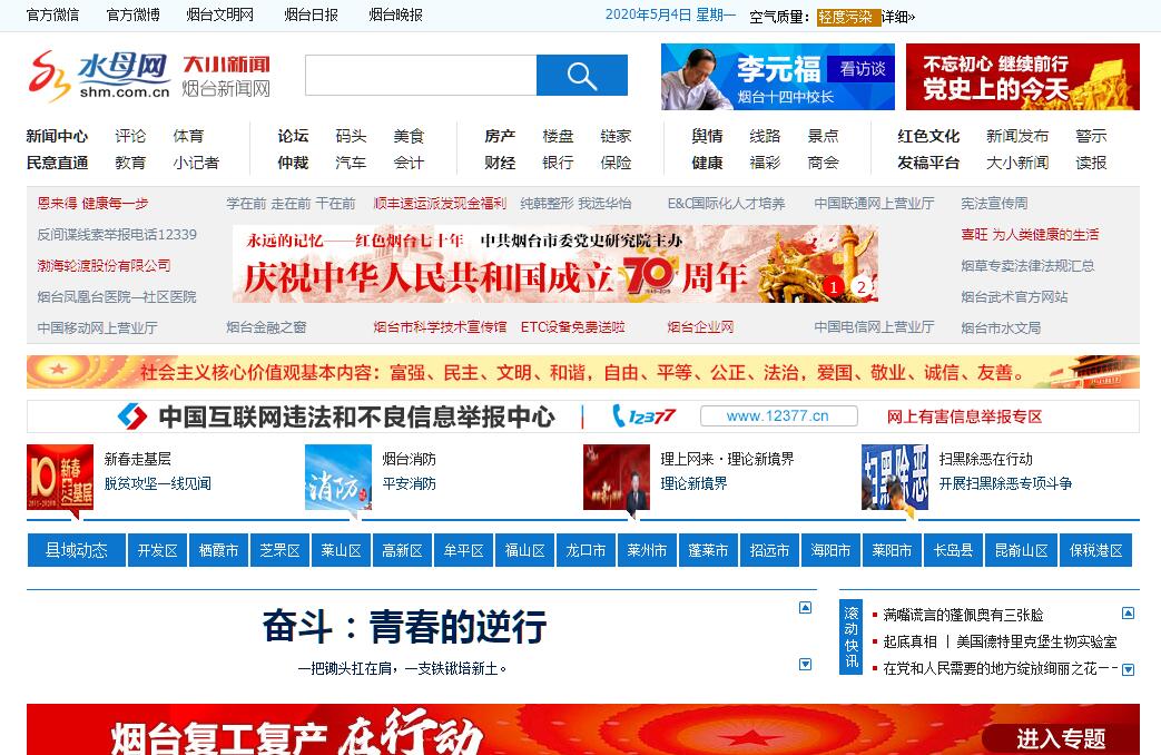 水母网(www.shm.com.cn),初建于2000年12月28日,是烟台第一家大型综合门户网站。水母网宣传烟台、服务烟台,是烟台市目前最大的网上新闻中心、网上公众信息服务中心。水母网系由烟台日报传媒集团/烟台星云信息传讯有限公司主办。水母网时政新闻由烟台日报传媒集团提供,文字、图片、视频等现场直播,24小时滚动播报。水母网是与烟台报纸、电视、广播等并列的第四大媒体,具有广泛影响力。水母网同时开设房产、汽车、财经、教育、健康、旅游、招聘、婚庆、美食等实用信息频道,帮助广大企事业单位和网民寻找商机和增加合作机会,共同构成“一站式宣传服务,一站式在线生活”平台,为客户和用户提供新闻信息、广告宣传、电子商务、网络营销、互动社区、行业分析、网上舆情、团购、展会活动等全方位的服务。平均每天逾50万台电脑登陆联机访问水母网,水母网读者具有较高的教育水平和一定经济基础、消费能力、计算机上网操作能力。烟台在中国地图上,呈现出一个水母的轮廓,这也是水母网命名的来历。在国际互联网世界里,水母网做为烟台城市门户网站,是烟台的一张网络名片,是国内外众多媒体、投资者、旅游者、读者了解和获取烟台信息的重要国际互联网平台。烟台市钟毓灵秀的自然景观和坚实的人文厚土,也招引和支撑水母网去走出一条风格独特的求新之路,展示烟台不断走向现代化的海滨城市独特地域风情和求新精神。