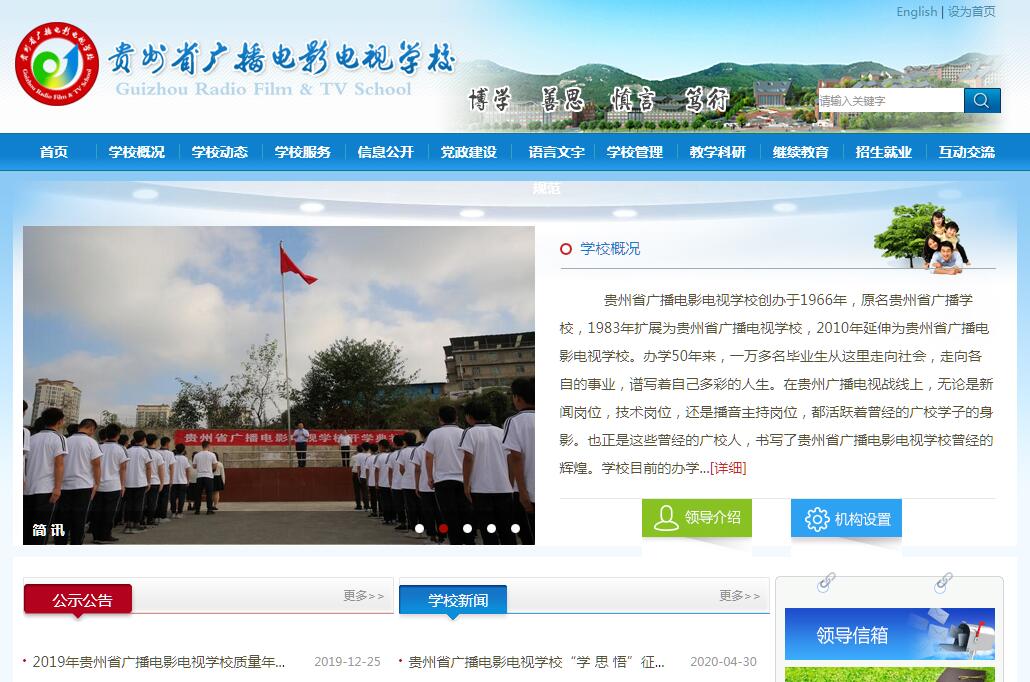 贵州省广播电影电视学校创办于1966年,原名贵州省广播学校,1983年扩展为贵州省广播电视学校,2010年延伸为贵州省广播电影电视学校。办学50年来,一万多名毕业生从这里走向社会,走向各自的事业,谱写着自己多彩的人生。在贵州广播电视战线上,无论是新闻岗位,技术岗位,还是播音主持岗位,都活跃着曾经的广校学子的身影。也正是这些曾经的广校人,书写了贵州省广播电影电视学校曾经的辉煌。学校目前的办学层次有中等职业教育、中国传媒大学函授与远程大专、本科教育。学校中职层次开设有播音与节目主持(含节目主持、新闻采编、旅游导游方向)、节目制作、电影放映与营销、电影放映技术、电子电工技术、网络与多媒体技术、酒店管理、汽车应用与维修等专业。广播电视技术相关专业是我校的传统专业,当前我省各地县广电事业的技术骨干大多是本专业的毕业生;新闻采编专业是我校的优势专业,众多的毕业生如今在我省新闻战线上大显身手。播音与节目主持专业是我校的品牌专业,在贵州,从贵州电视台,到贵阳电视台,再到地县级广播电视台,著名的播音员、节目主持人中,总能找到广校毕业生的名字。中国传媒大学函授与远程教育大专层次开设的专业有新闻与传播、摄影摄像技术、播音、广播电视技术等;本科层次开设的专业有新闻学、广播电视编导、电子信息工程、播音等。学校编制职为80人,其中管理岗位19人,专业技术岗位53人,工勤技能岗位8人。学校内设机构有12个科、室(中心),分别是校办公室、教务科、学生科、计财科、保卫科、招生与就业办公室、教育研究室、培训中心、后勤服务中心、新闻艺术科、广播电视技术科、电教实验室。学校总占地面积为120亩(阳关校区47亩,马王庙校区63亩,高新区实训基地10亩),总共建筑面积8229多平方米,其中教学楼2314平方米,学生宿舍楼3425平方米,食堂及生活用房2490平方米。贵州省新闻出版广电局指出,贵州省广播电影电视学校是贵州省广电事业的重要组成部分,广校的发展是大广电建设的需要,是建设和繁荣广电文化的需要。在十三五期间,要高层次、高规格、高质量地打造一所全新的广播电影电视学校,要以发展的眼光,长远的眼光对广校重新定位,发挥广校在大广电建设中人才储备的重要作用。围绕这一战略规划,学校的发展目标是:一、大力推进在清镇职教城的新校区建设,我校新校区选址在清镇职教城西区13号地块,占地面积304亩,规划建筑面积约17.5万平方米,总投资逾7.4亿元。规划建设项目有实训中心、体育馆、影视训练基地、图文信息中心等,设计在校生规模为5500人。二、着力完善办学功能,建设集技能教育、学历教育、在岗培训、产学研基地等为一体的规范化学校。三、全力构建综合的办学格局,形成学校与系统内企业合作,与其他社会企业合作,联合开发教育资源,促进学校科学发展、和谐发展、生态发展。四、努力建设合理的专业设置,根据社会需求,打造精品专业、优势专业、特色专业。