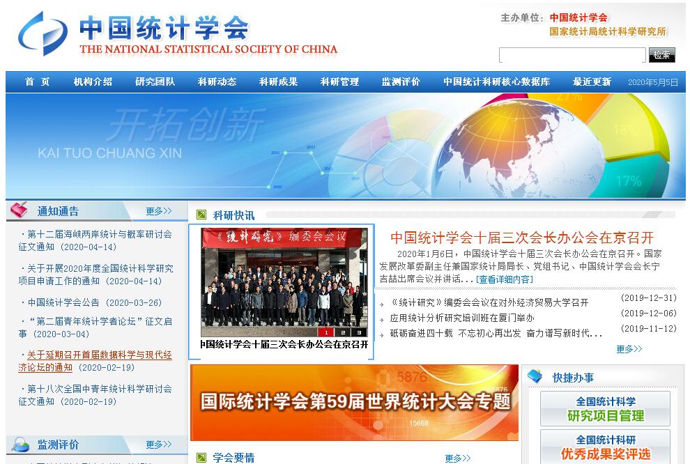 中国统计学会成立于1979年11月10日,同年经国务院批准参加国际统计学会第42届会议,并被接纳为该会的团体会员。中国统计学会是由从事统计工作和开展统计科学研究的相关单位和个人自愿结成的全国性、学术性、非营利性社会组织。学会接受社团登记管理机关中华人民共和国民政部和业务主管单位国家统计局的业务指导和监督管理。学会现有单位会员45个,分会12个。学会的宗旨是:以马克思列宁主义、毛泽东思想、邓小平理论、“三个代表”重要思想、科学发展观、习近平新时代中国特色社会主义思想为指导,贯彻百花齐放,百家争鸣的方针,研究统计科学理论和实践问题,提高我国统计科学水平,促进统计事业的发展,为建设有中国特色的社会主义现代化事业服务。学会的业务范围包括是:(一)组织、指导、推动会员积极参加统计学术活动;(二)总结、交流和推广统计科学研究成果和统计工作经验;(三)举办统计学术报告会和统计科学研讨会,依照有关规定,组织编写、翻译、出版、销售统计书刊;(四)根据政府相关部门的授权或委托,组织全国统计专业技术资格考试,开展统计专业技术资格评审;(五)普及和推广统计科学知识,组织统计培训;(六)调查研究统计工作中的问题,提出改进的建议,开展统计咨询活动;(七)开展统计学术国际交流活动,研究、介绍国外统计科学的最新研究成果和统计工作的发展情况;(八)开展与本会宗旨相关的其他活动。学会开展的学术活动:自成立以来,中国统计学会依靠全国广大的统计理论、教育工作者和实际工作者的共同努力,在各级统计机构的积极支持下,发展壮大了自己的队伍,推动了全国的统计科学研究和统计科学普及工作,交流了统计理论工作者和实际工作者的学术研究成果,开展了统计学术和国际交流活动,对提高我国统计科学水平和统计工作水平起了积极作用。学会共召开了19次全国统计科学讨论会和17次全国中青年统计科学研讨会。学会编辑出版的刊物有:《统计研究》和《调研世界》,在全国公开发行。《统计研究》于1984年创刊,2004年获国家期刊奖百种重点期刊,2012-2016年被评为中国最具国际影响力学术期刊,2015年被评为中国百强报刊,2018年被评定为“2018年度中国人文社会科学期刊AMI综合评价”A刊权威期刊。《调研世界》创刊于1988年,现为中文社会科学引文索引(2017-2018)扩展版来源期刊。中国统计学会将继续加强学术交流活动,继续保持与国内外统计学界友好合作关系,争取把学会建成一个“人才荟萃,联系广泛,充满活力,运行规范,成果显著,作用突出”的国内外知名学术团体,不断推动中国统计事业的繁荣发展。