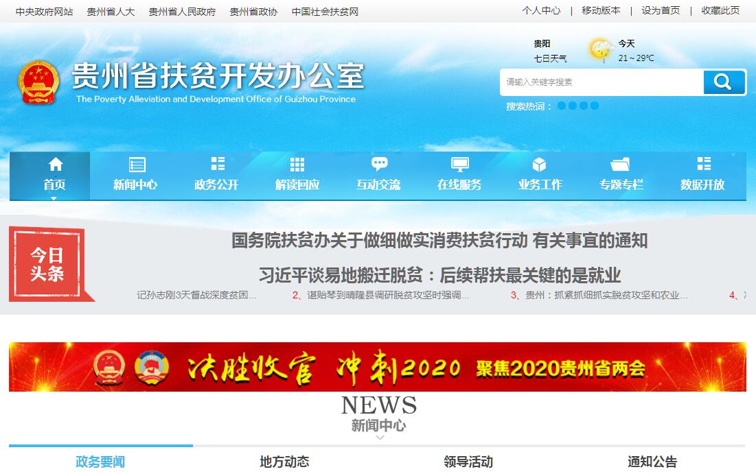 贵州省扶贫开发办公室,为省人民政府直属机构。其主要职责为:(一)贯彻执行国家和省有关扶贫开发工作方针、政策和法律法规,组织开展全省扶贫开发调查研究、统筹协调、督查督导工作。(二)拟订全省扶贫开发中长期规划,参与全省脱贫攻坚重大战略政策措施的顶层设计,提出全省扶贫开发工作目标、任务、政策和措施,并组织实施。(三)负责扶贫资金分配和监督管理。拟订中央、省下达的各类扶贫资金分配计划,指导各地对扶贫资金使用备案、监督管理、检查验收和绩效考核,指导扶贫开发项目库建设。(四)牵头市县两级党委和政府扶贫开发工作成效考核,负责贫困县退出检查评估。(五)负责东西扶贫协作的统筹协调和联络服务。(六)负责联络协调各级国家机关、国有企事业单位在我省的定点帮扶工作;负责香港、澳门定点帮扶协调联络;负责组织协调社会力量参与扶贫开发;承担省外、境外非政府组织和个人帮扶我省的联系、协调服务及交流与合作工作。(七)负责统筹、协调、指导各地各部门做好职责范围内脱贫攻坚工作任务,抓好督查督导、统筹调度、信息收集。(八)组织实施扶贫干部培训,配合相关部门做好贫困地区人力资源开发工作。(九)组织开展扶贫开发的统计监测、动态分析、成果宣传和经验交流工作。(十)结合部门职责,做好军民融合相关工作。(十一)加大科技投入,提高科技创新能力,为推进创新驱动发展提供保障。(十二)负责本部门、本行业领域的安全生产和消防安全工作。(十三)按规定做好大数据发展应用和政务数据资源管理相关工作,依法促进部门政务数据资源规范管理、共享和开放。(十四)承担省扶贫开发领导小组的日常工作。(十五)承办省委、省政府和国务院扶贫开发领导小组办公室交办的其他事项。