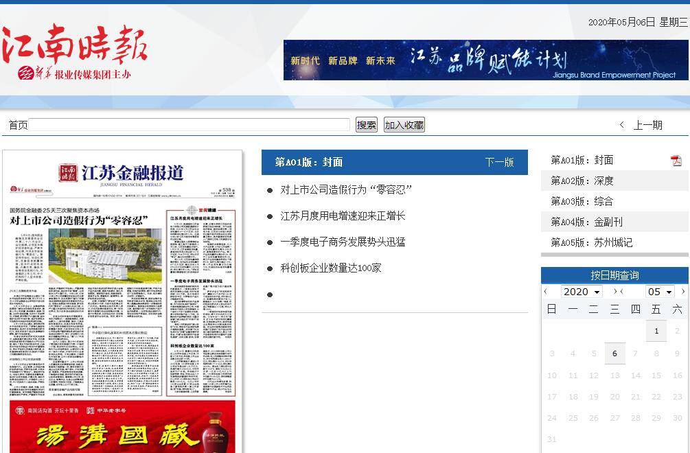 | 网站简介: 江南时报电子版,江南时报多媒体数字报。《江南时报》是新华报业传媒集团主管、以金融为特色的综合类财经报纸;2018年2月1日,《江南时报》转型为《江南时报•江苏金融报道》,成为江苏唯一的权威官方金融专业报。潜心以优质、深度、活泼的内容回报广大读者,设置的《经济与法》《金副刊》《金理论》等专版专刊,“江南三人行”“江南新视界”“一线奋斗者•最美金融人”等特色栏目深受认可。 |