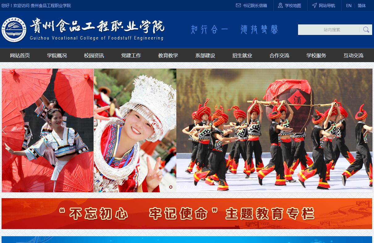 贵州食品工程职业学院创建于1953年,由贵州省发改委、贵州省粮食和物资储备局主管。是一所以服务贵州粮油食品产业,助力脱贫攻坚和乡村振兴为办学宗旨的全日制公办普通高等职业学院。学院以普通高等职业教育为主,同时举办中等职业教育、成人高等教育、国家职业技能培训与鉴定等工作。现有3个校区,占地614亩,其中清镇职教城乡愁校区514亩、贵阳北校区70亩、南校区30亩,校舍面积25.5万平方米。清镇职教城乡愁校区与风景如画的贵州风景名胜区红枫湖毗邻,北校区与风景优美的贵阳登高云山森林公园相伴,南校区位于风景秀丽的贵阳河滨公园边上,校园风景秀丽,环境宜人。建有现代化的教学实训楼、信息大楼、图书馆、田径运动场、体育馆、学生活动中心等基础设施,可容纳在校学生10000余人。学院坚持扎根贵州办学,围绕粮油食品产业对人才的需求,加强学科和专业建设。现有黔菜学院、金沙白酒学院、食品工程系、信息工程系、机电与建筑工程系、财经商贸系、文化艺术系、马克思主义教学部、基础部、继续教育部、中专部等11个教学单位,建有黔菜研究院、乡村振兴研究院2个科研机构,共33个专业,其中高职21个专业(粮油储藏与检测技术、食品质量与安全、食品贮运与营销、食品加工技术、绿色食品生产与检验、食品生物技术、粮食工程技术、酿酒技术、物流管理、会计、电子商务、财务管理、市场营销、物联网应用技术、数字媒体艺术设计、大数据技术与应用、机械制造与自动化(食品机械方向)、建筑工程技术、工程造价、舞蹈表演、音乐表演),中职12个专业(粮油储运与检验技术、会计电算化、物流服务与管理、建筑工程施工、电子商务、计算机平面设计、数字媒体技术应用、建筑装饰、物联网应用技术、学前教育、民族音乐与舞蹈、汽车运用与维修),有国家级中职示范专业5个,省级中职示范专业4个。学院拥有一支适应高职教育需求,品质优秀、结构合理、专兼结合的教师队伍。现有教职工300人,其中专兼职教师183人,高级职称占38.8%,硕士占26%,双师型教师比例为48.1%。有全国教学名师1人、全国优秀教师及优秀教育工作者5人、省级优秀教师4人。学校坚持“知行合一、德技双馨”的校训精神、“勤学砺技、慎思笃行”的学风和“尚德关爱、精技善教”的教风,努力培养具有人文精神、工匠精神的高素质技能型人才。现有全日制在校学生6200人,学生参加全国职业院校技能大赛获省部级以上奖项200多项。建校66年来,已为社会培养和输送了各级各类毕业生近8万人,他们中80%以上成为我省粮油食品战线上出得来、回得去、留得住、用得上、有作为的永久牌人才,为贵州经济社会发展作出了积极的贡献。不少毕业生成长为政府部门和企事业单位领导干部或业务技术骨干,有的成为企业家,涌现出一批各级劳动模范,其中有2人被选为“贵州十佳优秀企业家”。近来年,学院就业率稳定在98%以上,用人单位满意率在97%以上。学院坚持政产教农融合发展理念,先后与清镇市人民政府、兴仁市人民政府、贵州黔菜出山餐饮管理有限公司、贵州沃涵餐饮管理有限公司、贵州省储备粮管理总公司、中央储备粮贵阳直属库等120余家政府及企事业单位建立了合作关系,建有38个实训室及40余家校外实训基地。与华东理工大学、贵州大学、贵州师范大学等高校合作开办函授、自学考试。除与贵州省内高校开展“3+2”专升本合作外,我院还将拓宽同国外高校合作的渠道,积极开展“2+1”高职联合培养、“3+1”专升本、“3+2”专升硕等国际合作办学,培养学生国际视野,积极提升办学的国际化水平。同时,还是国家粮食和物资储备局、省财政厅、省教育厅、省人社厅确定的职业技能培训及职业资格鉴定单位,面向社会开展农产品检验、仓储管理、会计、计算机高新技术等各种长短期培训,年培训鉴定人数3000余人次,为企业培训鉴定一大批技能型人才,深受社会一致好评。经过66年的建设发展,现已成为首批全国重点建设示范性中专学校、首批国家级重点中专学校、全国职业教育百家(A)类学校、中国诚信学校、全国百所“工学结合、半工半读”试点学校、国家级计算机应用与软件专业实训基地,部级重点中专学校、省级重点中专学校、贵州省计算机与网络技术职业教育集团挂靠单位及理事长单位、首批贵州省特色文化学校。学院还是贵州省职业教育师资培训基地、贵州省会计电算化培训单位、贵州省公务员计算机综合应用能力培训点、全国计算机信息高新技术考试点;先后荣获全国职业教育先进单位、全国粮食系统先进集体、全国群众体育先进单位,贵州省文明单位、贵阳市文明单位、贵州省德育工作先进单位、贵州省体育卫生工作先进单位等100多项荣誉称号。学院正紧紧围绕“三大战略”“五张名片”,围绕“一带一路”“乡村振兴”“长江经济带”,坚持扎根贵州,服务粮油食品产业,努力建成高水平、有特色,人民满意、师生幸福的优质职业院校。