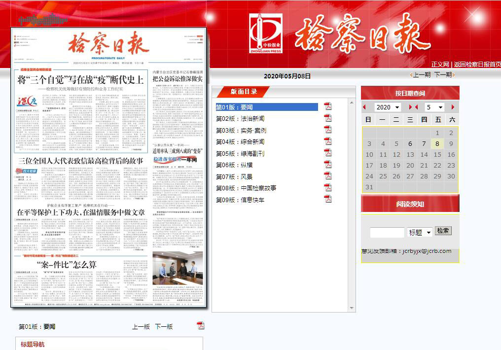 | 网站简介: 检察日报电子版,检察日报多媒体数字报。《检察日报》由中华人民共和国最高人民检察院主办。它立足检察,宣传法治,及时报道社会主义法制建设的最新动态、热点和难点问题,高扬反腐倡廉的旗帜。它向读者全方位地展示法制社会尤其是检察机关保护人民、惩罚犯罪的光辉业绩,使读者知法、懂法、守法,了解如何依法保护国家、集体利益和个人的合法权益。《检察日报》的前身《中国检察报》创刊于1991年7月4日,1996年1月1日更名为《检察日报》。2011年7月8日,《检察日报》创刊20周年座谈会在最高人民检察院举行。20年来,该报逐渐从周刊发展为日报,从单一的报纸发展为以报纸、杂志为主体,以影视、网络为两翼的法治专业传媒。该报坚持做到“检察新闻社会化、社会新闻法治化、法治新闻专业化”,在服务检察工作和民主法治建设中发挥着积极的作用。《检察日报》每周推出《声音周刊》、《廉政周刊》、《法治评论》周刊、《明镜周刊》、《绿海周刊》,以警醒世人的大案要案、精辟缜密的经法透视和耐人深思的社会问题追踪,以及环球司法最新动态,带给读者新感觉、新视角、新思维。2018年3月,获“2017年百强报纸”荣誉。 |