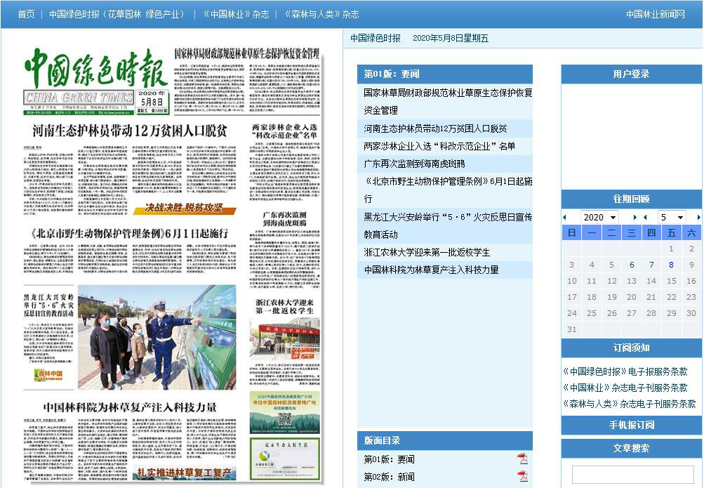 | 网站简介: 中国绿色时报电子版,中国绿色时报多媒体数字报。《中国绿色时报》是我国林业系统的行业报,也是我国唯一以“绿色”命名的国家级生态环境类社会性报纸,其前身为1986年林业部创办的《中国林业报》,主办单位是全国绿化委员会和国家林业局。《中国绿色时报》以“顺应绿色潮流,荟萃绿色信息,倡导绿色时尚,共建绿色家园”为己任,紧密配合我国可持续发展战略的实施和“再造秀美山川”伟大事业的深入开展,及时准确地传递着党和国家有关林业和生态环境建设的政策、法规信息,以丰富、权威的经济、科技、市场资讯为中国绿色事业和绿色产业提供服务和支持。 |
