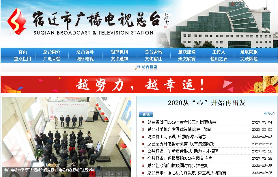 1996年,随着地级宿迁市的成立,在原县级宿迁电视台、广播电台的基础上升格组建了地级宿迁电视台和广播电台。2005年1月原宿迁电视台和原广播电台合并、局台分设成立宿迁市广播电视总台,属市政府直属正处级事业单位,具有独立法人资格。主要承担市域内的广播、电视新闻、专题宣传,以及其他各类节目的采集制作和传输发射任务。目前,总台内设中层机构25个,下设企业3个(宿迁广电传媒有限公司、宿迁广电文化产业有限公司、江苏咕咕鸟文化传播有限公司),控股企业1个(江苏楚韵网络文化传媒有限责任公司(西楚网))。宿迁市广播电视总台(集团)现有职工380人,拥有综合、公共2个电视频道,18个自办电视节目;拥有新闻综合(FM92.1)、交通频率(FM101.9)、音乐频率(FM105.5)3个广播频率,29个自办广播节目。作为主流媒体,宿迁市广播电视总台(集团)在宿迁及周边地区拥有广泛影响力,广播、电视所占市场份额在宿迁地区处于突出地位。多年来,宿迁市广播电视总台(集团)围绕党委政府中心工作,唱响主旋律,打好主动仗,用电波和镜头见证着宿迁跨越发展的历程,展示着项王故里壮美的景色,讲述着老百姓动人的故事,传颂着宿迁改革开放丰硕的成果,为全市发展营造了良好的舆论氛围,极大地丰富了500多万宿迁人民的精神文化生活。《宿迁新闻》、《楚风夜话》、《直通12345》、《宿迁廉风》、《我们悦读会》、《政(行)风热线》等重点打造的广播电视节目得到了受众的喜爱与关注。2015年,总台积极顺应“媒体融合”发展趋势,依托“互联网+”,建设宿迁手机台,推广轻快自媒体项目。宿迁手机台自2015年9月18日上线运行以来,访问量已突破5500万人次,注册用户数与手机台下载安装数均突破60万,长时间位居全国轻快云平台广电百强榜榜首,先后获得“全国最具影响力手机台”“最具人气手机台奖”“年度最具综合实力手机台”等多项全国性大奖,成为宿迁市不可或缺的新媒体平台,也成为全国广电移动客户端名副其实的行业标杆。数百家电视台来总台观摩交流。在将宿迁广电影响力扩展至国内外的同时,也延伸、提升了宿迁广播电视广告价值、品牌价值、市场价值。面对飞速发展、日新月异的新媒体时代,宿迁市广播电视总台面临着诸多的竞争与挑战。站在新的历史起点,全台干部职工将按照“振奋精神、更新观念、团结苦干、务求突破”的新要求,奋勇拼搏,全力开启新一轮跨越发展、加速振兴的新征程,全力推进总台发展迈上新水平,不断向“全省一流、全国有影响”的目标迈进。回首过去,豪情满怀;展望未来,激情澎湃。发展路上,我们将大胆改革、勇于创新、奋力前行、跨越赶超,奏响最强音,再创新辉煌!