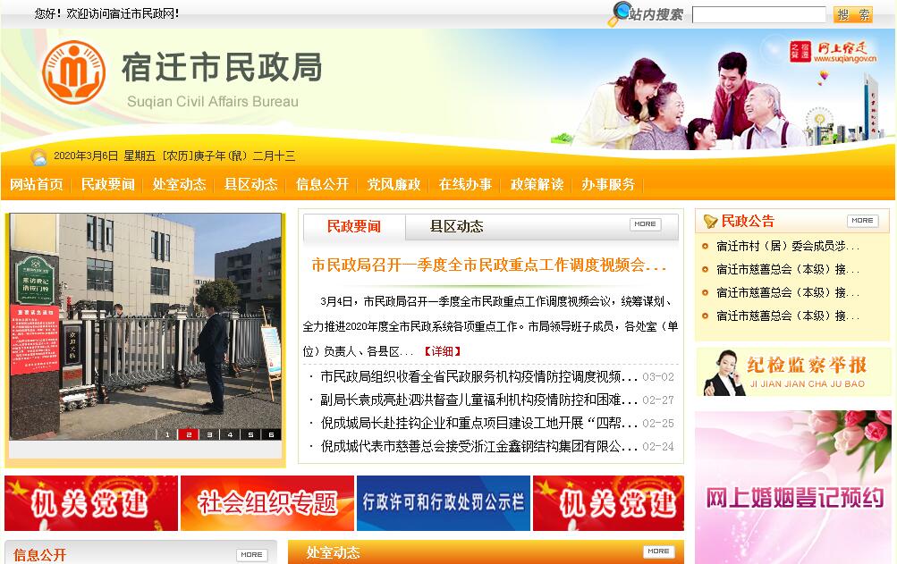 宿迁市民政局主要职责:(一)拟订全市民政事业发展规划,起草有关行政措施,并组织实施和监督检查。指导全市民政工作的改革和发展。(二)拟订全市社会团体、民办非企业单位管理办法。承担依法对社会团体、民办非企业单位进行登记管理和执法监察责任。(三)拟订全市优抚配套措施、标准和办法,承担由民政部门管理的伤残人员伤残抚恤管理工作,承担追认革命烈士的审核报批和革命烈士褒扬工作。组织和指导拥军优属工作,承担市拥军优属拥政爱民工作领导小组的有关具体工作。 (四)拟订退役士兵、复员干部、军队离退休干部和军队无军籍退休退职职工安置措施及计划,组织指导各地军供站、军人接待转运站和移交地方安置的军队离退休干部休养所(服务中心)的服务管理工作,组织指导全市退役士兵职业技能培训工作。(五)拟订全市救灾工作配套措施,负责组织、协调救灾工作,组织自然灾害救助应急体系建设,负责组织核查并统一发布灾情,管理、分配救灾款物并监督使用,组织、指导救灾捐赠。承担市减灾委员会办公室具体工作。(六)拟订全市社会救助规划、标准、办法,健全城乡社会救助体系,负责城乡居民最低生活保障、医疗救助、临时救助、生活无着人员救助和无固定收入的重度残疾人生活救助工作,指导五保户社会救济工作,组织实施低收入家庭认定工作。(七)拟订全市行政区划和行政区域界线、地名管理办法,承担行政区划、行政区域界线和地名管理工作。(八)拟订全市城乡基层群众自治组织建设和社区建设配套措施,指导社区服务体系建设,提出加强和改进城乡基层政权建设的建议,推动基层民主政治建设。(九)拟订全市社会福利事业发展规划、社会福利机构管理办法和社会福利企业扶持措施,拟订促进慈善事业发展的办法,组织、指导社会捐助工作,指导老年人、孤儿和残疾人等特殊群体权益保障工作。(十)拟订全市婚姻管理、殡葬管理、儿童收养和城市生活无着的流浪乞讨人员救助工作措施,推进婚俗和殡葬改革,指导婚姻、殡葬、收养、救助服务机构管理工作。(十一)拟订全市福利彩票发行工作配套措施和实施办法,组织指导全市福利彩票发行管理工作,管理市级福利彩票公益金。(十二)会同市有关部门按规定拟订社会工作发展规划和职业规范,推进社会工作人才队伍建设和相关志愿者队伍建设。(十三)指导县(区)民政系统财务工作,监督民政事业费的使用管理。受理来信来访,指导县(区)民政系统信访工作。(十四)拟订全市老龄工作配套措施并组织实施,承担市老龄工作委员会的具体工作。(十五)承办市政府交办的其他事项。