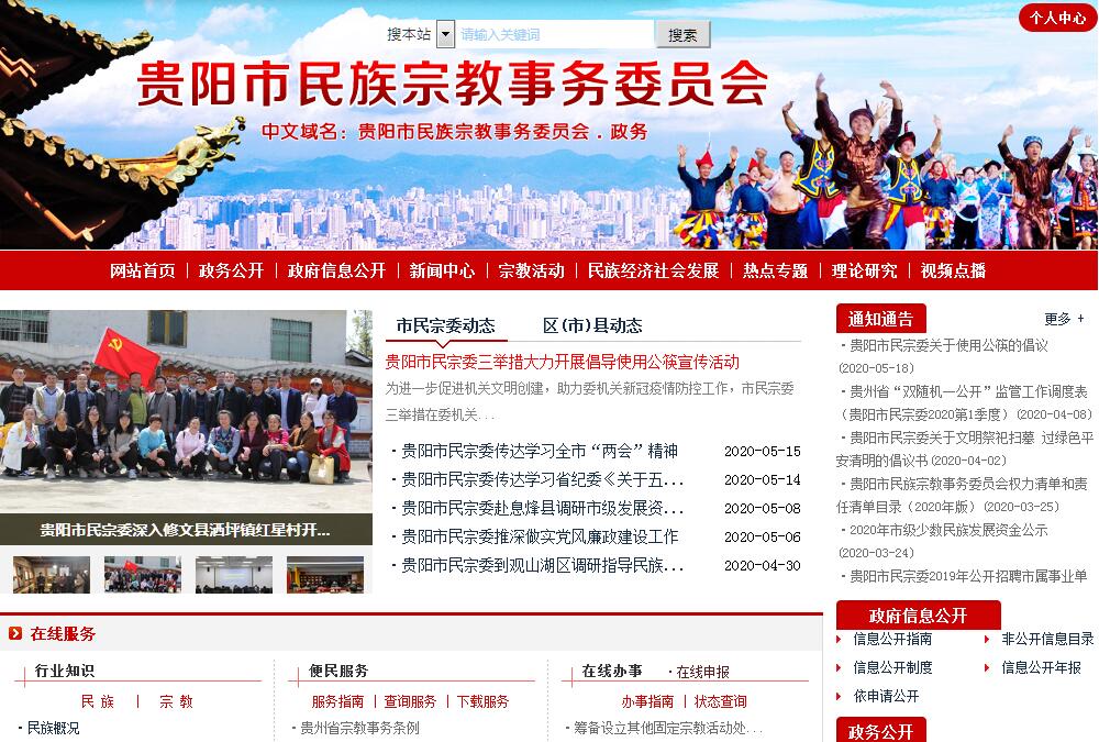 贵阳市民族宗教事务委员会主要职责:一、组织开展民族理论、民族宗教政策和民族宗教工作重大问题的调查研究,分析、汇总有关工作动态与信息,提出有关民族宗教工作的政策建议。二、拟订贯彻民族宗教事务工作法律法规的实施意见,起草有关民族宗教法规草案和政策措施,协调推动和督促检查有关部门履行民族宗教工作相关职责,促进民族宗教政策和法律法规在经济发展和社会事业有关领域的实施、衔接。三、组织指导民族宗教政策、民族宗教法律法规的宣传教育工作,负责民族团结进步表彰活动相关事宜,指导和协调民族宗教重大节庆活动,负责宗教事务方面的外事归口管理工作,组织指导宗教界对外以及港澳台的宗教交往活动,参与涉及民族宗教的对外宣传工作。四、提出协调民族关系、宗教关系的工作建议;协调处理民族关系、宗教关系、民族宗教事务中的重要事项、重大事件;参与民族宗教领域社会稳定工作;防范利用民族关系、利用宗教进行的非法活动;抵御境外利用宗教进行的渗透活动。五、研究少数民族和民族地区经济发展、社会事业方面的问题并提出政策建议,参与协调民族地区科技发展和经济技术合作;拟订少数民族事业专项规划并监督检查实施;参与拟订少数民族和民族地区经济社会相关领域的发展规划,促进建立和完善少数民族事业发展规划综合评价监测体系,推进民族事务服务体系和民族事务管理信息化建设。六、依法履行宗教事务管理职责,承担宗教事务行政执法监管事项,保护公民宗教信仰自由和正常的宗教活动,维护宗教界的合法权益,促进宗教关系和谐。七、指导宗教团体依法依章开展活动,支持宗教团体加强自身建设,推动宗教团体在宗教界开展爱国爱教、拥护祖国统一和民族团结的自我教育,负责办理宗教团体需由政府解决的相关事务和行政许可监管工作。八、参与拟订少数民族人才队伍建设规划,联系少数民族干部,协助有关部门做好少数民族干部的培养、选拔和使用工作;承办宗教工作队伍有关人员的培训工作。九、管理少数民族语言文字工作,指导少数民族语言文字的翻译、出版和民族古籍的搜集、整理、出版工作。十、指导区(市、县)人民政府民族宗教工作部门依法履行民族宗教事务管理职责。十一、结合部门职责,负责本部门、本行业领域的安全生产和消防安全工作;按规定做好大数据发展应用和政务数据资源管理相关工作,依法促进部门政务数据资源规范管理、共享和开放。十二、承办市委、市人民政府和省民族宗教事务委交办的其他事项。