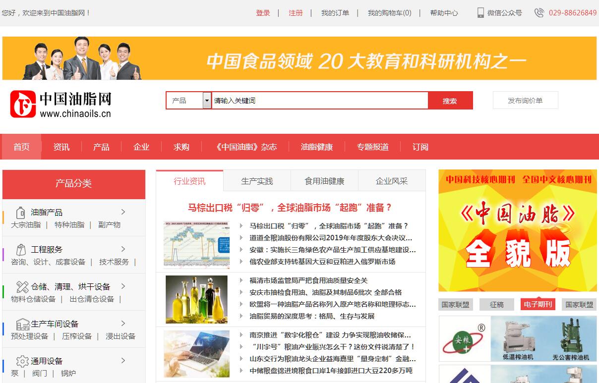 | 网站简介: 中国油脂网(www.chinaoils.cn)是集新闻信息、油脂健康、工艺研究、和基础服务为一体的油脂行业门户网站。中国油脂网服务于油脂行业用户,致力成为最具传播力和互动性,权威、主流、便捷的油脂行业互联网媒体平台。通过强大的实时新闻和全面深入的信息资讯服务,为油脂行业的互联网用户提供富有创意的网上新生活。中国油脂网依托《中国油脂》杂志强大的专家编委、作者和读者群以及广告客户群,充分发挥其覆盖面广、信息量大、引领油脂科技前沿的优势和特点,集创新、导向、合作、交流于一体,为油脂行业决策管理、生产服务、商品贸易、人才交流提供最专业、细致的服务。中国油脂网经过全新改版,B2B商城系统全新上线。全新的企业、产品展示商铺,数十种精美店铺模板,全新的订单、在线支付和商圈功能,为企业提供更有效果的展示和宣传作用。 |