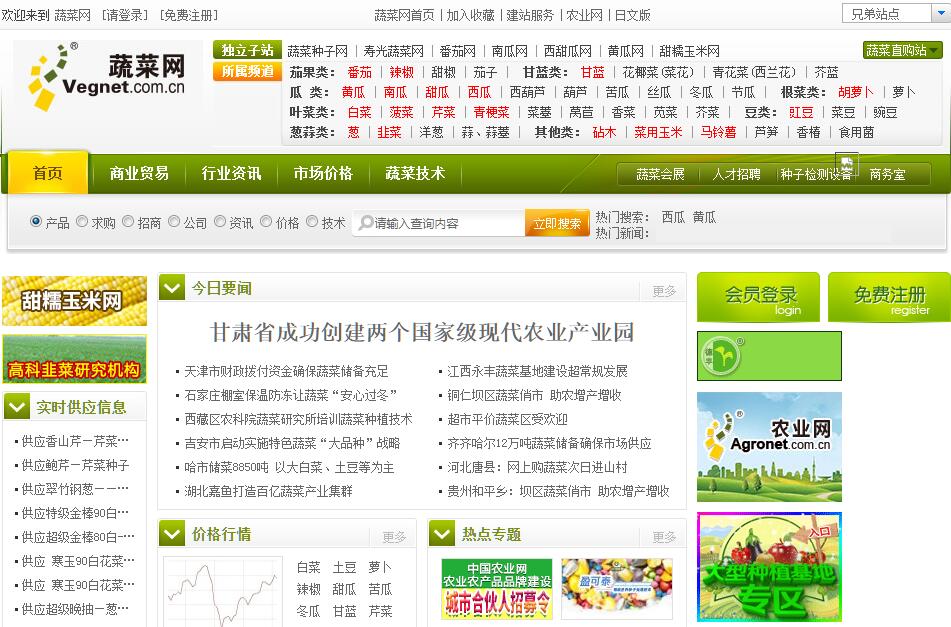 | 网站简介: 蔬菜网是一家集互联网信息、电子商务和线下服务于一体的蔬菜行业专业网站。自1999年成立以来,一直引领蔬菜产业信息化潮流,是中国蔬菜产业信息化的成功典范。在过去的10余年,蔬菜网以“综合涵盖+行业细分”的双重模式整合蔬菜行业资源,全面服务行业各层面,已经发展成为目前国内蔬菜以及相关农业行业知名的一个专业商务平台网站! |