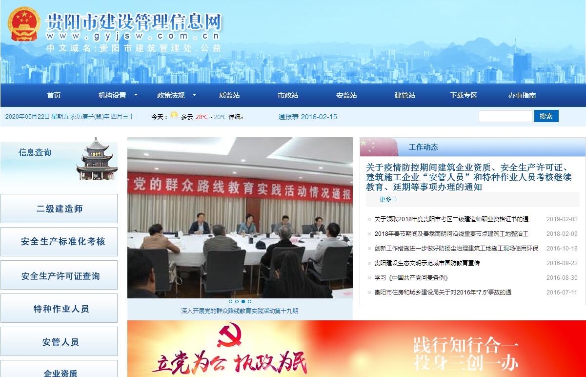 贵阳市建设管理信息网由贵阳市建筑管理处主办。贵阳市建筑管理处是贵阳市建设局下属的事业单位,受贵阳市建设局的委托对贵阳市建筑业进行行业管理,由贵阳市建筑队伍管理站、贵阳市建筑工程质量监督站、贵阳市建筑安全监督检查站、贵阳市城乡建设定额站、贵阳市建筑管理处市政工程质量安全监督站、贵阳市建筑管理处金阳工作站、工程竣工验收备案管理办公室、及处办公室、财务科、政工科、建安劳保办等部门组成。各部门从不同的角度对贵阳市建筑市场进行多方的管理,为建筑市场管理提供服务,主要工作职责是:按照行业管理法令、法规承担对建筑工程施工许可证核发与管理、贵阳市建筑业企业统计管理;对贵阳市建筑施工企业的资质等级初审管理、工程承发包合同的备案及建筑市场的管理;负责工程质量监督和安全生产管理;对建筑工程进行定额管理与监督;负责工程竣工验收备案管理等。贵阳市建筑管理处是为了适应改革开放的要求,根据国务院《关于改革建筑业和基本建设管理体制若干问题的暂行规定》[国发(1984)123号]和贵州省人民政府《关于建筑业改革的若干规定》[黔府(1984)49号]文的要求,在1984年先后成立质监站、建管站、定额站、招投标办公室的基础上,于1992年根据市编委《关于设立贵阳市建筑管理处的批复》[市编字(1992)第50号文](新增贵阳市建筑安全检查站和处办公室)合并成立的贵阳市建筑管理处,后经市编委“筑机构编办(1997)87号”批准提升为副县级事业单位。贵阳市建筑管理处的成立,通过无数“建管人”多年来的不懈的追求,最终成功地建立了贵阳市建筑市场管理体系,使建筑市场行为纳入政府有效的监督管理中,使建筑物这一与社会、人民生活息息相关的产品置于科学、严格的管理之中。同时积极引进先进管理体系,改革建筑管理模式,引导行业进步,构筑建筑市场反腐新防线,培育健康的建筑市场运作秩序,较为圆满完成了各项工作任务,为提高和规范贵阳市建筑市场和建筑行业管理水平做出了一定的贡献。本着对社会服务的宗旨,建管处严格行业管理,强化监督管理服务,在对贵阳市建筑业管理中取得较好成绩。改革开放以来贵阳市未出现一起房屋倒塌的重大质量事故,贵阳市建筑安全管理已处于全国先进行列,在97年全国建筑安全大检查中,受检工程全部评为优良,名列全国省会城市第四名。近几年,贵阳市安全监督工作取得历史最好水平,贵阳市建筑工程质量监督站获全国先进质监站称号。在城市建设飞速发展中,市建管处也发展成为我省专业技术力量较强,检测手段完备,管理水平较高的一流的建筑行业主管单位,是贵阳地区权威的管理机构。市建管处现有专业技术人员118人,其中高级职称 14名、中级职称51名,初级职称47人,专业人员包含工程建设、道路、桥梁、市政、水电、电梯、玻璃幕墙方面的专家,并且建立了全省门类齐全、技术一流的专家网,全部由贵州省建筑业各界的专家组成,成为贵阳市建筑工程招投标管理、工程质量、安全监督的技术后盾。推行建筑管理工作的网上办公、电子政务,建立开通了的“贵阳建设”网站,提高依法行政,建立廉洁高效的服务型的政府管理部门形象。为建设一流的建管机构,贵阳市建筑管理处在全国建筑管理部门、全省行政事业单位中率先建立并推行了ISO9000质量保证体系,并于2000年12月顺利通过了国际认证。贵阳市建筑管理处于2007年12月被中华人民共和国人事部、中华人民共和国建设部评为全国建设系统先进集体。