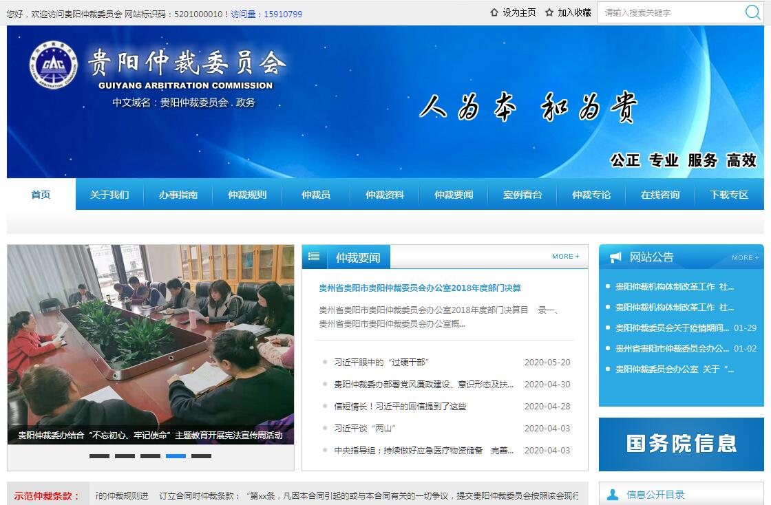 贵阳仲裁委员会(以下简称“本会”)是依据《中华人民共和国仲裁法》的规定登记成立的民商事仲裁机构。本会主任、副主任和委员由法律、经济贸易专家或有法律、经济贸易实际工作经验的人员担任;本会设立专家咨询委员会、监察考核委员会、仲裁发展委员会三个专门委员会;办公室下设综合处、立案接待处、仲裁业务一处、仲裁业务二处、民商事调解中心等五个处室;聘请来自于法律、房地产、建设工程、贸易、金融、保险、知识产权等领域的200多名专家或知名人士担任仲裁员。本会根据当事人达成的仲裁协议,仲裁平等主体之间的合同纠纷和其他财产权益纠纷。仲裁依法独立进行,不受行政机关、社会团体和个人的干涉。仲裁实行“一裁终局”制度,并充分体现“中立公正、专家办案、亲和解纷、保密便捷、灵活及时”的特点。仲裁裁决书或调解书具有法律拘束力,如一方当事人不履行的,另一方当事人可申请人民法院执行。本会受理平等主体的自然人、法人和其他组织之间发生的合同争议和其他财产权益争议案件。包括:(一)国内争议案件;(二)国际(含涉外)争议案件;(三)涉及中国香港特别行政区、澳门特别行政区和台湾地区的争议案件; 本会依据双方当事人签订仲裁协议和一方当事人的仲裁申请受理仲裁案件,并不受地域限制。