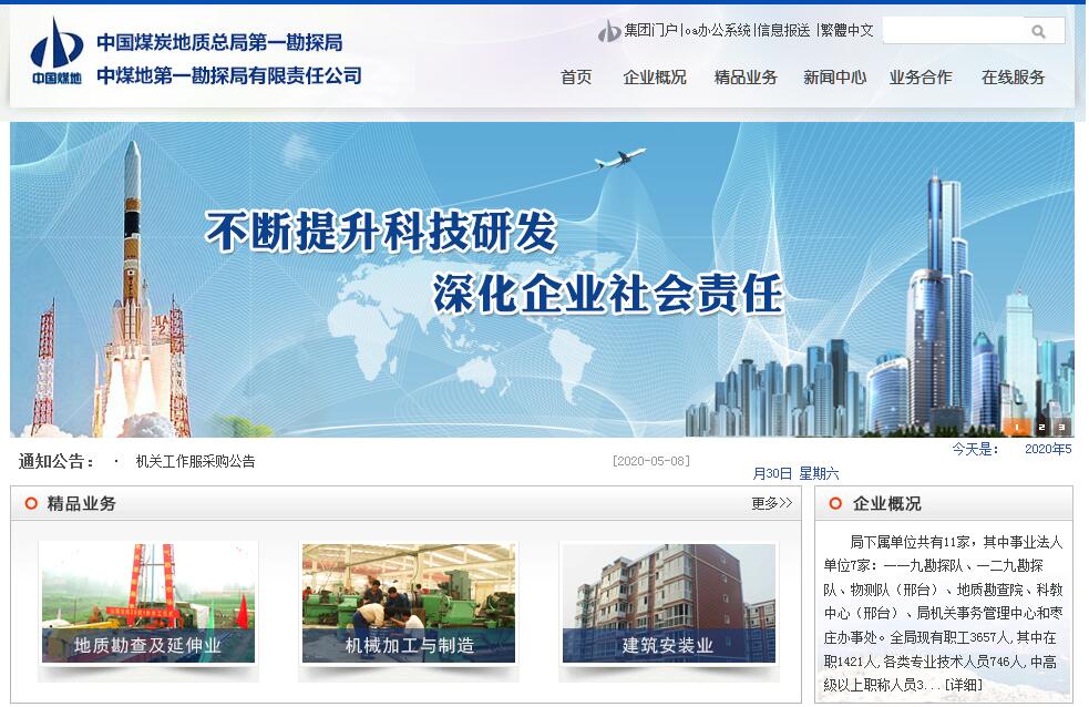 中国煤炭地质总局第一勘探局始建于1974年,前身为燃料化学工业部邯邢煤田地质勘探指挥部,1980年更名为煤炭部第一地质勘探公司,1991年更名为中国煤田地质第一勘探局,2001年更名为中国煤炭地质总局第一勘探局并沿用至今。局机关驻地在河北省邯郸市。2010年,根据事转企要求,第一勘探局出资成立了中煤地第一勘探局有限责任公司,并取得企业法人营业执照,公司与中国煤炭地质总局第一勘探局实行一套人马、两块牌子的管理运营模式。建局40年来,第一勘探局逐步形成以地质勘查、基础工程施工、建筑安装工程为主业,以工程地质、环境地质、灾害地质、城市地质、测绘、矿业、机械等为一体的发展格局。局下属单位共有11家,其中事业法人单位7家:一一九勘探队、一二九勘探队、物测队(邢台)、地质勘查院、科教中心(邢台)、局机关事务管理中心和枣庄办事处。企业法人单位4家:河北丰华重工机电设备制造有限公司、中煤光华地质工程有限公司、邯郸华辰建筑安装工程有限公司、邢台光华煤炭工程监理有限公司。全局共有固体矿产、地质钻探、气体矿产、地球物理勘查、测绘、煤炭工程监理等甲級资质12个,拥有多个水文地质、工程地质、环境地质、液体勘查、工程勘查乙級资质,以及房屋建筑工程施工总承包贰級资质、地基与基础工程专业承包壹級资质等。全局现有职工3657人,其中在职1421人,各类专业技术人员746人,中高級以上职称人员301人,教授級高工和享受特殊津贴16人,离退休2236人。建局近40年来,施工足迹遍布全国各地地,并走出国门在印尼、伊朗、蒙古等国家勘探施工。共为国家提交各类地质技术成果300多项,其中地质报告200多件, 51件报告被评为全国优质地质报告,共探明煤炭储量1300多亿吨,为我国煤炭工业的发展做出了重大贡献。全局坚持科技兴局和人才强局的发展战略,先后完成150多项科研项目,其中《中国煤层气资源评价》、《煤层气储层特征及其评价研究》、《煤层气控气潜能因素》、《中国洁净煤研究》项目经国家鉴定达到国际领先水平,对推动全局的科技进歩以及加快我国煤炭地质科技研究歩伐发挥了积极作用。围绕经济发展、技术进步,第一勘探局党的建设、企业文化建设、和谐单位建设、思想政治工作和精神文明建设也都取得很大进歩。局队先后获得“功勋勘探队”“全国地质勘查先进单位”“全国百强地质队”“全国煤炭系统文明单位”“邯郸市文明单位”等称号。“十三五”期间,第一勘探局将全面贯彻落实党的十九大精神,以中国煤炭地质总局“11463”总体发展战略为统领,以第一勘探局“12318”发展目标为引导,牢固树立“以市场为导向、以客户为中心、以科技创新为引领”的理念,以“大格局、大地质、大经营、大客户”为出发点,聚焦地质技术服务商、矿产资源开发商、基础施工承包商 “三商”定位,围绕转变观念、转型发展、走向国际市场、走向井下市场、走向中小城市市场“两转三走”,强化地质勘查产业、水工环地质产业、地理信息产业、地下工程产业,矿业运营和科技公司运营“四地两运营”,优化提升传统产业,开拓布局新兴产业,精心培育核心竞争力,着力推进创新驱动战略,形成特色鲜明、优势突出、集约高效的产业新格局,以“三队一院”为落脚点,延伸产业链,提升矿山全生命周期服务能力,全力开拓生产经营的新局面,全面承担起国家能源战略国家队的职责,打造新型地勘野战军。