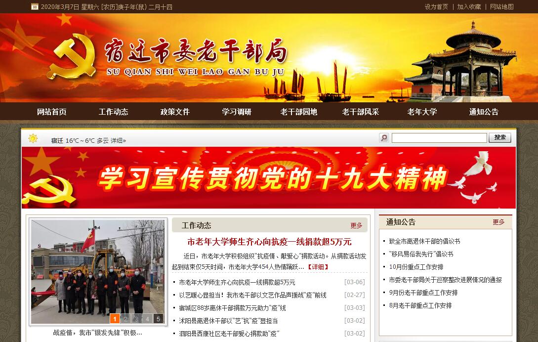 宿迁市委老干部局为市委正处级部门管理机构,由市委组织部管理,负责全市离休干部和市级机关、市直企事业单位市管干部退休后(以下简称为退休干部)的管理工作。其主要职责是:(一)贯彻落实省委和市委有关老干部工作的方针政策,督促检查老干部政治、生活待遇的落实,充分发挥老干部作用。(二)对全市老干部工作中的情况和问题进行调查研究,为市委、市政府决策提供依据。(三)制订或参与制订符合我市老干部工作实际的有关政策规定。(四)协同有关部门指导老干部党支部的建设、及时了解掌握老干部的思想状况和要求,协调新闻、宣传部门宣传老干部工作,宣传老干部的历史功绩和在改革开放中的现实作用;联系涉老部门的工作。(五)负责离休干部荣誉证书的审核发放工作。(六)贯彻落实老干部易地安置政策,协调老干部的易地安置工作,审核办理有关安置手续。(七)配合有关部门拟订老干部医疗保健和康复事业发展规划;组织指导老干部开展健康疗养、文化、体育等有益身心健康的活动;负责重大节日和经常性走访慰问老干部工作;负责老干部重大活动的组织安排。(八)受理老干部的来信来访。(九)贯彻落实省委和市委关于处级退休干部工作的方针政策,对市级机关和市直企事业单位处级退休干部工作的情况和问题进行调查研究,配合有关部门提出解决的办法,为市委、市政府决策提供依据。(十)负责离休干部信息管理系统的建设、管理和使用,开展从事老干部工作的人员培训工作。(十一)完成市委和市委组织部交办的其他任务。