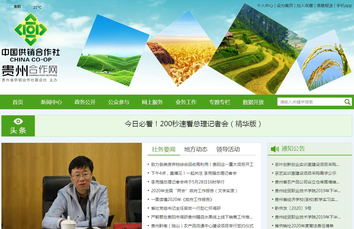 贵州合作网由贵州省供销联社主办。贵州省供销联社是全省供销合作社的联合组织,由省人民政府管理。其主要职责是:(一)宣传贯彻党和国家及省委、省政府有关农村经济工作和社会发展的方针政策和法律法规,拟订全省供销合作社的发展战略和规划,指导合作社制度建设和改革与发展。(二)按照政府授权对重要农业生产资料和农副食品等经营进行组织、协调和管理;负责指导全省供销社系统化肥农药储备与供应工作;加强对全省供销社企业烟花爆竹经验活动的管理。(三)指导和推动全省农村合作经济组织发展;指导全省供销合作社系统发展专业合作社、消费合作社及涉农行业协会;参与有关法规、规章草案的起草和政策的拟订,推动和促进合作经济的发展。(四)向省人民政府和有关部门提供农民社员和供销合作社的建议,加强党和政府与农民密切联系的桥梁和纽带作用。(五)指导全省供销合作社基层组织建设,促进基层社加强民主管理,密切同农民的联系,协调成员社之间的关系,发挥全体联合优势。(六)加强组织创新和经验创新,组织实施农村现代流通网络建设和综合服务体系建设,开拓城乡市场,促进城乡经济社会协调发展;兴办各类农副产品批发市场,培育农产品加工龙头企业;领办农业开发项目和扶贫项目;参与和推动农业产业化经营。(七)组织开展社员和职工的教育与培训,为全省供销合作社提供信息服务。(八)监督、管理和运营本级社有资产,对直属企事业单位依法行使出资人职能,享有出资人权益。(九)对相关行业、学科或业务范围内的全省性社会团体,履行业务主管单位的职责。(十)承办省人民政府和全国供销合作总社交办的其他事项。