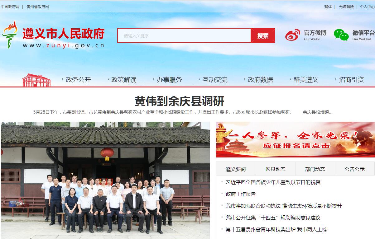 遵义,古称播州,名始于唐贞观十六年,取义《尚书》“无偏无陂,遵王之义”。国土面积30762平方公里,辖3区2市9县和新蒲新区,户籍人口800万,中心城区人口近200万。地处西南出海要道,全域纳入长江经济带,是贵州第二大城市。2018年,完成地区生产总值3000.23亿元,增长10.4%,排全省第3位;规模工业增加值增长12.1%,排全省第1位;固定资产投资增长17.8%,排全省第2位;一般公共预算收入达252.14亿元,增长16.5%,排全省第1位;社会消费品零售总额增长8.7%,排全省第2位;金融机构存贷款余额分别增长3.3%、19.5%;城乡居民人均可支配收入分别达32312元、12265元,分别增长9%、10.2%;全面小康实现程度达92%。红色遵义经典磅礴。伟大转折铸就不朽丰碑。1935年,红军长征在这里转战三个多月,召开了彪炳史册的遵义会议,演绎了四渡赤水出奇兵的经典战例,挥就了《忆秦娥·娄山关》的悲壮名作。这里,是党第一代中央领导集体开始形成的地方,是毛泽东思想开始形成的地方,是党独立自主解决自身重大问题开始的地方。醇香遵义意韵天成。好山好水好酒好茶。遵义酒,雅俗集于一身,醇烈融于一体,带着最传奇、最经典的故事纵贯古今。茅台酒、董酒、习酒、珍酒等名酒享誉神州。遵义茶,陆羽《茶经》盛赞“其味极佳”,茶园面积贵州第一,“湄潭翠芽”“凤冈绿宝石”“遵义红”“正安白茶”频频摘金折桂。醉美遵义积淀丰厚。自然人文景观星罗棋布。桫椤王国神秘幽远,乌江画廓移步换景,双河溶洞长冠亚洲,竹海茶海花海浑然天成。拥有丹霞地貌、海龙屯土司遗址世界“双遗产”。森林覆盖率59%。20万年前,古人类在此繁衍生息。东汉时期文字学一代宗师尹珍开西南文化教育先河,抗战期间浙江大学西迁遵义办学,赢得“东方剑桥”美誉,全国仅有的2个仡佬族自治县比肩同行。西部遵义蓄势谱新篇。兰海高速纵贯南北,杭瑞高速横跨东西,贵遵复线宽敞便捷,县县通高速、村村通油路;川黔铁路、渝贵高铁穿山越岭,赤水河、乌江航运通江达海;遵义机场、茅台机场比翼双飞,立体型交通体系基本形成。国家级经济技术开发区、综合保税区、高新技术园区助推遵义深度融入长江经济带、接轨“一带一路”。老区遵义扬势促跨越。酱香白酒、优质烤烟、红绿白茶、地道药材、特色食品“五张名片”刷新中外,电子信息、新医药大健康、现代山地高效农业、文化旅游、新型建筑建材“五大新兴产业”发展壮大,“四在农家·美丽乡村”酿造甜蜜乡愁,“四民社区·美丽城市”点亮城镇生活,“基层服务型党组织升级创建”打通联系服务群众“最后一公里”。先后荣获国家环保模范城市、第五届全国文明城市称号。名城遵义乘势建功业。以习近平新时代中国特色社会主义思想为指导,深入贯彻落实党的十九大精神和习近平总书记在贵州代表团的重要讲话精神,不忘初心、牢记使命,坚守“两条底线”,推进“四个全面”,大力实施大扶贫、大数据、大生态战略行动,推动新型工业化、山区城镇化、农业现代化、旅游产业化“四个轮子”一起转,决战脱贫攻坚、决胜同步小康,奋力谱写百姓富、生态美的遵道行义新篇章。