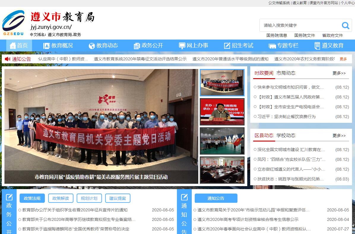 遵义教育网由遵义市教育局主办。遵义市教育局(市委教育工委)贯彻落实党中央、省委、市委关于教育工作的方针政策和决策部署,在履行职责过程中坚持和加强党对教育工作的集中统一领导。其主要职责是:(一)贯彻执行党和国家的教育方针、政策和法律、法规;拟订全市教育事业发展规划,并指导、协调和监督实施,起草有关教育工作的实施意见。(二)贯彻落实中央、省委和市委关于统一战线的方针、政策,并统筹指导全市教育系统统一战线有关工作;研究和指导全市教育系统党的建设,制定或参与制定全市教育系统党的建设有关政策和制度;规划、协调和指导教育系统党员教育、管理和发展工作;指导教育系统组织队伍建设;组织开展新时代教育系统党的建设理论研究;统筹指导教育系统党的理论宣传、思想政治建设、精神文明建设、意识形态和全市教育系统新闻宣传工作;指导全市教育系统加强党风廉政建设工作,实施对教育系统党员特别是党员领导干部的监督管理;协助市委抓好市属高校及其他有关单位领导班子和干部队伍建设;统筹指导市属高校“双一流建设”工作,协助省委教育工委和市委指导和推进市属高校管理体制改革。(三)加强全市基础教育统筹管理,推进义务教育均衡发展,促进公共教育资源进一步向农村和少数民族地区倾斜,促进教育公平;全面实施素质教育,切实减轻中小学生课业负担,加强中小学德育工作,指导义务教育发展水平和质量监测。(四)大力发展职业教育,深化职业教育改革,提高职业院校办学水平和质量,积极推进职业教育体制机制创新,进一步增强职业教育发展活力。(五)深化教育领域综合改革,加强教育行政干部暨教师队伍建设,加强校长教师交流,推进基础教育课程改革、教育人事制度改革、教师专业技术职务改革和招生考试制度改革。(六)制定全市教育发展规划,统筹管理市本级教育经费,监督全市教育经费的筹措和使用情况;负责经费预决算方案的编制,指导所属学校编制经费预决算方案;负责编制各项教育专款和市本级教育费附加使用方案;负责指导市直属学校教育事业费、基建计划和基建投资管理和财务管理以及国有资产的监督管理;负责全市教育工程管理;负责全市教育基本信息和年报的统计、分析和发布。(七)统筹和指导少数民族教育工作,协调对少数民族和少数民族地区的教育援助。(八)加强民办教育的统筹规划、综合协调和指导管理,贯彻落实促进民办教育发展的政策措施,规范办学秩序,促进民办教育事业健康发展。(九)规划、指导全市各级各类学校德育、法制宣传教育、体育卫生与艺术教育及国防教育工作,指导各级各类学校安全稳定工作。(十)管理和指导全市校长教师工作,实施教师资格制度;规划、指导全市校长和教师队伍建设;制定全市中小学、幼儿园校(园)长和教师培养培训、继续教育规划并组织实施。(十一)管理和指导国家教育统一考试工作;配合市属高校做好大学生思想政治工作和毕业生离校前的就业指导工作。(十二)统筹管理全市教育系统的对外合作与交流;协调市属学校教师出国留学和聘请外籍教师、教育外援方面的有关工作。(十三)承担市人民政府教育督导室的具体工作,根据国务院《教育督导条例》的规定,行使市人民政府赋予的教育督导职权。依法组织对本级政府有关部门、各县(市、区)人民政府及有关部门落实教育法律、法规、规章和国家教育方针、政策等履行教育职责情况进行督导检查;对全市各级各类学校和其他教育机构依法办学、教育教学工作进行督导评估,监测全市基础教育阶段教育质量,指导下级教育督导工作。(十四)承担市语言文字工作委员会的具体工作。(十五)结合部门职责,加大科技投入,为推进创新驱动发展提供保障;负责本部门、本行业领域的安全生产和消防安全工作;按规定做好大数据发展应用和政务数据资源管理相关工作,依法促进部门政务数据资源规范管理、共享和开放。(十六)承办市委、市人民政府和省教育厅交办的其他事项。