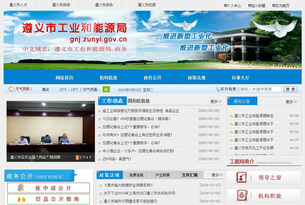 遵义市工业和能源局主要职责:(一)承担综合协调服务全市工业经济运行,承担推进新型工业化、信息化、能源建设和管理的职责,拟订新型工业化发展战略和政策,研究并协调解决新型工业化进程中的重大问题;拟订并组织实施工业发展规划,推进产业结构调整和优化升级,推进高新技术与传统工业改造结合。(二)承担推进工业化与信息化融合发展的职责,协调建设中的重大问题;拟订工业化与信息化融合发展规划、计划和政策并组织实施;推动工业领域信息资源的开发、利用、共享及互联互通;指导协调工业企业信息化发展和信息化应用,运用新一代信息技术改造和提升传统产业。(三)拟订工业行业规划、计划,组织实施有关产业政策;提出优化产业布局、结构的政策建议;起草相关地方性法规、规章草案,拟订地方性行业技术规范和标准并组织实施;组织开展工业、工业化和信息化融合的对外交流与合作。(四)监测分析工业经济运行态势并发布相关信息,进行预测预警和信息引导;协调解决行业运行发展中的有关问题并提出政策建议;负责工业应急管理、产业安全和国防动员有关工作。(五)负责提出工业、工业化与信息化融合固定资产投资规模及方向、提出申报中央、省财政性建设资金安排的建议,按照规定权限审批、备案和核准固定资产投资项目;承担市级财政工业和信息化专项资金管理和安排工作,拟订年度计划并组织实施;按规定承担工业产业基金管理有关工作;承担工业、信息化企业固定资产投资减免税审核工作;指导工业和信息化领域投资项目机电设备招标工作。(六)拟订高技术产业中涉及生物医药、新材料、电子信息制造业等的规划、政策和标准并组织实施;组织开展国家、省和市重大技术攻关项目及有关国家科技重大专项行动,组织参与工业、信息化新产品、新技术鉴定工作;拟订市级财政技术创新资金年度计划并组织实施;指导行业技术创新和技术进步,推进产学研结合,促进科研成果产业化;承担企业技术中心、制造业创新中心和技术创新示范企业等技术创新体系培育工作。(七)负责工业行业管理;承担振兴装备制造业组织协调的职责,指导引进重大技术装备的消化创新;推进工业领域生产性服务业的发展;参与军民两用技术成果推广、相互转化和产业化以及配合做好工业领域军民融合重大项目建设工作;负责盐业行业管理工作;承担原材料行业管理工作,提出全市重要矿产资源保障的政策措施,协调解决原材料工业生产要素的供应保障;指导行业质量管理和品牌建设工作;指导工业领域行业协会工作;依法开展民爆物品生产销售安全的监管;负责督促相关行业加强安全生产管理,推进相关行业安全生产规程、标准的贯彻落实。(八)组织拟订工业园区发展规划及政策措施;负责工业园区规划布局;监测分析工业园区发展情况,指导推进工业园区产业定位和工业园区发展;协调解决工业园区发展中的重大问题并提出政策建议。(九)拟订促进中小企业融通发展政策措施并组织实施;负责中小企业、非公有制经济和城镇集体经济的指导、综合协调工作,会同有关部门拟订促进中小企业发展、非公有制经济发展和城镇集体经济发展的相关政策和措施,协调解决重大问题;指导民营企业建立现代企业制度,推进生产要素市场化建设;负责全市中小企业服务体系建设;指导民营经济、中小企业的自主创新和技术创新;协调解决重大问题;按规定管理用于支持中小企业发展的各类财政性资金。(十)拟订工业和信息化年度节能计划、资源综合利用和清洁生产的规划并组织实施;指导工业绿色发展;监督管理相关行业资源综合利用工作;组织协调工业和信息化领域节能和综合利用新产品、新技术、新设备、新材料的推广应用;拟订工业、信息化节能监察标准及计划并组织实施,协调散装水泥生产发展和推广应用工作。(十一)协调解决经济运行中的重大问题并提出政策建议;承担全市煤、电、油、气、运调度和综合协调保障工作;承担工业用煤、成品油、天然气的协调和紧急调运工作;协调电力调度,推进电力需求侧管理工作;负责铁路运输综合协调工作,参与交通综合运输协调。(十二)提出全市能源发展战略的建议,拟订能源发展规划、产业政策并组织实施;起草有关能源发展和能源行业监督管理的地方性法规草案;推进能源体制改革,拟订有关改革方案,协调解决能源发展和改革中的重大问题。(十三)负责煤炭(含煤层气、煤化工及煤炭加工转化为清洁能源产品)、电力(含火电、水电、气电、核电)、石油、天然气、新能源(含风能、光能、生物质能)和可再生能源等能源的行业管理;组织实施能源行业标准,监测能源发展情况;按规定权限,核准、审核或上报能源固定资产投资项目;指导协调农村能源发展工作。(十四)拟订煤炭开发、煤层气、煤制燃料和燃料乙醇、煤化工、煤炭加工转化为清洁能源产品的发展规划、计划和政策并组织实施;组织协调开展淘汰落后产能、煤层气开发、煤矿瓦斯治理和利用工作。(十五)负责能源安全生产监督管理。检查督促能源企业落实安全生产技术标准,组织开展能源安全生产专项整治和能源企业安全生产标准化工作,指导督促能源企业对行业职工开展安全生产技能和安全生产知识培训;承担油气管道安全监督管理、新能源和可再生能源安全监督管