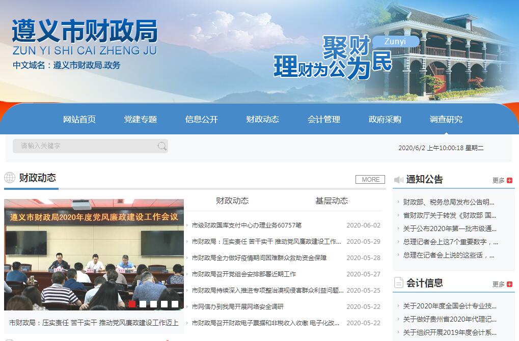 遵义市财政局主要职责:(一)拟订并组织实施全市财税规划、政策和改革方案。分析预测经济形势,参与制定各项经济政策,提出运用财税政策实施综合平衡社会财力的建议,拟订相关分配政策,完善鼓励公益事业发展的财税政策,贯彻落实财税体制改革各项政策措施。(二)起草财政、财务、会计管理的制度,组织涉外财政、债务等相关事宜并草签有关协议、协定。(三)指导全市财政收支管理,负责市级财政收支管理,具体编制年度市级财政预算草案并组织执行。受市政府委托,向市人民代表大会报告全市和市级财政预算及执行情况,向市人民代表大会常务委员会报告财政决算及预算调整方案。拟订经费开支标准、定额,负责审核批复部门(单位)的年度预决算。(四)加强和改进预算管理,建立全面规范透明、标准科学、约束有力的预算制度。实施预算绩效管理。(五)加强对政府债务管理的统筹、协调、指导,强化政府债务管理职责。(六)负责政府非税收入管理,承担行政事业性收费、政府性基金及其他非税收入管理工作。管理财政票据。(七)拟订国库管理制度、国库集中收付制度,指导和监督国库业务。(八)拟订行政事业单位国有资产管理制度,管理行政事业单位国有资产。组织实施政府采购政策、制度并监督管理。(九)汇总编制市级国有资本经营预决算草案,拟订国有资本经营预算的制度和办法,收取市级企业国有资本收益,组织实施企业财务制度,参与拟订企业国有资产管理相关制度。(十)会同有关部门管理市级财政的经济发展支出、中央和省政府性投资项目资金、政策性补贴和专项储备资金,参与拟订建设投资的有关政策。(十一)会同有关部门管理市级社会保障和就业及医疗卫生支出。会同有关部门拟订社会保障资金(基金)的财务管理制度,编制社会保险基金预决算草案。(十二)执行国家政府债务管理和中央代地方发行国债管理的制度和政策,防范财政风险。负责政府外债谈判业务,并按规定对国际金融组织以及外国政府对我市的贷(赠)款进行管理。(十三)负责地方金融企业财务监管工作。管理地方金融类企业国有资产。(十四)执行国家统一的会计制度,负责管理会计工作,监督和规范会计行为,监督会计师事务所的业务。(十五)监督检查财税法规、政策的执行情况,提出加强财政管理的建议。(十六)制定财政系统教育培训规划,组织财会人员开展财政、会计业务知识培训。(十七)负责全市财政系统信息化建设,加强计算机网络信息建设。负责财政信息和财政宣传工作。(十八)结合部门职责,加大科技投入,为推进创新驱动发展提供保障;负责本部门、本行业领域的安全生产和消防安全工作。按规定做好大数据发展应用和政务数据资源管理相关工作,依法促进部门政务数据资源规范管理、共享和开放。(十九)承办市委、市人民政府和省财政厅交办的其他事项。
