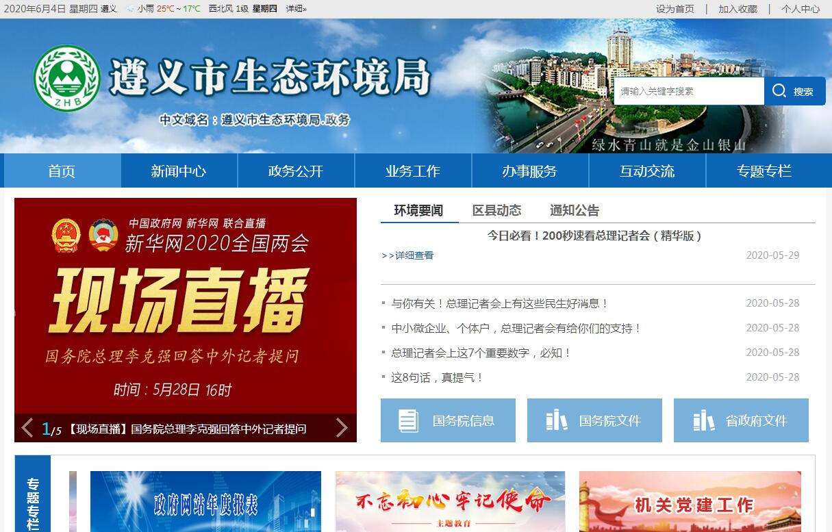 遵义市生态环境局主要职责:(一)全面贯彻落实生态环境基本制度。会同有关部门拟订全市生态环境政策、规划并组织实施,起草地方性生态环境法规、规章草案。会同有关部门编制并监督实施重点区域、流域、饮用水水源地生态环境规划和水功能区划;贯彻生态环境标准、技术规范。(二)负责生态环境问题的统筹协调和监督管理。牵头协调环境污染事故和生态破坏事件的调查处理,指导协调地方政府对突发生态环境事件的应急、预警工作,牵头指导实施生态环境损害赔偿制度,协调解决有关跨区域环境污染纠纷,统筹协调全市重点区域、流域生态环境保护工作。(三)负责监督管理全市减排目标的落实。组织制定贯彻各类污染物排放总量控制、排污许可证制度的措施并监督实施,确定大气、水等纳污能力,贯彻实施国家、省制定的污染物总量控制种类及控制指标,监督检查各地污染物减排任务完成情况,实施生态环境保护目标责任制。(四)负责提出生态环境领域固定资产投资规模和方向、市财政性资金安排的意见,按市政府规定权限审批、核准规划内和年度计划规模内固定资产投资项目,配合有关部门做好组织实施和监督工作。参与指导推动循环经济和生态环保产业发展。(五)负责环境污染防治的监督管理。制定贯彻大气、水、土壤、噪声、光、恶臭、固体废物、化学品、机动车等的污染防治管理制度的措施并监督实施。会同有关部门监督管理饮用水水源地生态环境保护工作,组织指导城乡生态环境综合整治工作,监督指导农业面源污染治理工作。监督、管理、指导区域大气环境保护工作,组织实施区域大气污染联防联控协作机制。(六)指导协调和监督生态保护修复工作。组织编制生态保护规划,监督对生态环境有影响的自然资源开发利用活动、重要生态环境建设和生态破坏恢复工作。组织制定各类自然保护地生态环境监管制度并督促检查。监督野生动植物保护、湿地生态环境保护、荒漠化防治等工作。指导协调和监督农村生态环境保护,监督生物技术环境安全,牵头生物物种(含遗传资源)工作,组织协调生物多样性保护工作,参与生态保护补偿工作。(七)负责核与辐射安全的监督管理。贯彻核与辐射安全有关政策、规划、标准的措施,牵头负责核安全工作协调机制有关工作,参与核事故应急处理,负责辐射环境事故应急处理工作。监督管理核设施与放射源安全,监督管理和设施、核技术利用、电磁辐射、伴有放射性矿产资源开发利用中的污染防治;开展辖区辐射环境质量监测及污染源监督性监测工作;开展辐射污染防治宣传教育。(八)负责生态环境准入的监督管理。受市政府委托对重大经济和技术政策、发展规划以及重大经济开发计划进行环境影响评价。按规定做好重大开发建设区域、规划、项目环境影响评价相关工作。拟订并组织实施生态环境准入清单。(九)负责生态环境监测工作。制定贯彻生态环境监测制度和规范、相关标准的措施并监督实施。会同有关部门统一规划生态环境质量监测站点设置,组织实施生态环境质量监测、污染源监督性监测、温室气体减排监测、应急监测。组织对生态环境质量状况进行调查评价、预警预测,组织承建和管理生态环境监测网和生态环境信息网,推动生态环境大数据建设。实行生态环境质量公告制度,统一发布全市生态环境综合性报告和重大生态环境信息。负责污染源自行监测、污染源自动监控的组织协调和综合监管。(十)负责应对气候变化工作。组织拟订贯彻应对气候变化及温室气体减排重大战略、规划和政策的措施,综合协调应对气候变化相关工作。(十一)负责贯彻落实生态环境保护督察制度,接受中央、省委生态环境保护督察,组织调度全市有关中央、省委生态环境保护督察整改工作,开展生态环境保护督察考核,提出生态环境保护督察问责建议。(十二)组织指导和协调生态环境宣传教育工作,制定并组织实施生态环境保护宣传教育纲要,推动社会组织和公众参与生态环境保护。开展生态环境科技工作,组织生态环境科学研究和技术工程示范,推动生态环境技术管理体系建设。(十三)承担生态环境国际合作交流工作。组织协调有关生态环境国际条约的市内履约工作,参与处理涉外生态环境事务。(十四)结合部门职责,加大科技投入,提高科技创新能力,为推进创新驱动发展提供保障;负责本部门、本行业领域的安全生产和消防安全工作;按规定做好大数据发展应用和政务数据资源管理相关工作,依法促进部门政务数据资源规范管理、共享和开放。(十五)完成市委、市人民政府和省生态环境厅交办的其他任务。