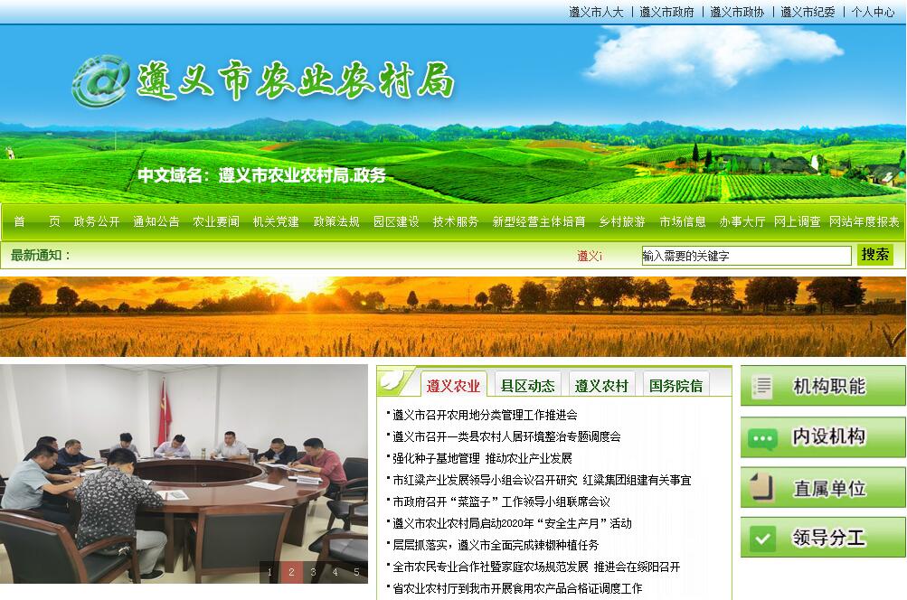 遵义市农业农村局主要职责:(一)贯彻落实党中央、省委、市委关于“三农”工作的方针政策和决策部署。组织全市乡村振兴战略实施。起草农业农村经济社会发展综合性文稿。提出农村改革与发展重大问题的原则和措施建议。提出农业产业保护政策建议。参与涉农财税、价格、收储、金融保险、进出口等政策制定。(二)研究拟订全市种植业、畜牧业、渔业、农业机械化、农垦等农业各产业(以下简称农业产业)和农村经济发展战略、中长期发展规划并组织实施。指导全市粮油、畜禽乳、水产品等主要农产品供给生产,调整优化农业产业结构。组织构建现代农业产业体系、生产体系、经营体系。负责种植业、畜牧业、渔业、农业机械化、农垦等农业产业和渔政渔港的监督管理工作。(三)负责特色优势主导产业、农产品加工业、休闲农牧渔业等一体化建设。承担农产品加工业发展、农业产业化经营、大宗农产品市场体系建设。指导农村合作经济组织、新型农业经营主体和农业社会化服务体系建设与发展。承担农产品品牌培育、保护及管理等工作。负责农业交流合作工作。(四)承担农业农村经济体制改革。研究提出农村经济体制改革和巩固完善农村基本经营制度的意见建议。指导农村土地承包、耕地使用权流转和承包纠纷仲裁工作。负责农民承包地、农村宅基地改革和管理工作。指导农村集体产权制度改革、农村集体经济组织发展及集体资产管理工作。(五)承担农业资源区划工作。指导农用地、渔业水域(滩涂)以及农业生物物种资源的保护与管理,负责水生野生动植物保护、耕地及永久基本农田质量保护工作。指导农产品产地环境管理和农业清洁生产。指导设施农业、生态循环农业、节水农业发展以及农村可再生能源综合开发利用、农业生物产业发展。牵头管理农业领域外来物种。组织开展现代农业园区建设工作。(六)参与农村社会事业发展。推动发展农村社会事业、农村公共服务、农村文化、农村基础设施和乡村治理。牵头组织改善农村人居环境。指导农村精神文明和优秀农耕文化建设。(七)承担农业投资管理工作。拟订农业开发规划,负责编制市级投资安排的农业投资项目建设规划,提出农业投融资规模和方向、扶持农业农村发展财政项目的建议,负责农业投资项目、农业综合开发项目、农田整治项目、农田水利项目资金安排和监督管理工作。(八)负责农业生产安全工作。执行农产品质量安全国家标准,指导全市农业标准化生产。组织实施农产品质量安全的监督管理,依法开展农产品质量安全监测、追溯、风险评估。指导农业检验检测体系建设。负责农业动植物新品种保护和农业转基因生物安全监督管理。指导农业机械化和农机安全监理工作。实施拖拉机驾驶员培训机构的行政许可及监督管理。组织兽医医政、兽药药政药检工作。负责执业兽医和畜禽屠宰行业管理。(九)负责农业投入品管理工作。依法开展农作物(特产经济作物)种子(种苗)、草种、水产苗种、种畜禽、农药、肥料兽药、渔药、饲料、饲料添加剂、兽医医疗器械和渔机渔具的监督管理。组织、协调农业生产资料市场体系建设。会同有关部门监督实施有关农业生产资料国家标准。(十)承担动植物防疫和检疫体系建设。指导实施动植物防疫检疫工作,组织、监督动植物的防疫检疫工作,发布疫情并组织扑灭。负责动植物重大疫情和重大病虫害防控。组织植物检疫性有害生物普查。承担外来引进农作物种子(种苗)和动物检疫审批工作。(十一)承担农业农村信息化建设。承担农业各产业产品、农业生产资料供需等相关情况的预测、统计、发布工作。负责农业农村经济运行监测、分析及发布工作。参与大数据发展应用和政务数据资源管理相关工作。负责农业农村信息服务体系建设。(十二)承担农业防灾减灾救灾工作。负责农业灾情的统计、监测、发布工作,指导种子、化肥、农膜等救灾物资储备和调拨,提出生产救灾资金安排建议,组织灾后生产自救等工作。(十三)负责农业科技相关工作。指导推动农业科技体制改革和农业科技创新体系建设。指导农业产业技术体系和农技推广体系建设,组织开展农业领域的高新技术和应用技术研究、科技成果转化和技术推广。(十四)指导农业农村人才工作。拟订全市农业农村人才队伍建设规划并组织实施,指导农业教育和农业职业技能开发,指导新型职业农民培育、农业科技人才培养和农村实用人才培训工作。(十五)结合部门职责,加大科技投入,为推进创新驱动发展提供保障;负责本部门、本行业领域的安全生产和消防安全工作;按规定做好大数据发展应用和政务数据资源管理相关工作,依法促进部门政务数据资源规范管理、共享和开放。(十六)承办市委、市人民政府和省农业农村厅交办的其他事项。