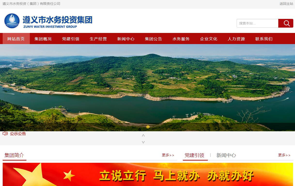| 网站简介: 遵义市水务投资(集团)有限责任公司是以遵义市供排水总公司、遵义市湘江水利水电开发有限责任公司为基础,整合遵义市水利局下属的遵义灌区一期工程、遵义市海龙水库工程、遵义市万里水库工程、水利水电建设总公司、水利水电开发公司、水利水电物资站;遵义市城管局下属的江河城市排水管网有限公司、中心城区污水截流工程、北部新城污水处理工程配套管网;遵义市供排水公司所属青山水厂;遵义县(现播州区)水利局所属自来水公司;红花岗区水利局所属红岩水库、东城水厂等15个水务单位于2013年5月组建而成,是遵义市人民政府下属国有控股公司,注册资本34.12亿元。遵义市水务投资(集团)有限责任公司目前下辖供水公司、北部污水处理厂、新蒲供水公司、中桥原水供应公司等11个分子公司,现有员工1200余人,总资产为98亿元,净资产34.783亿元,日供水能力55万吨,日污水处理能力29.5万吨。遵义市水务投资(集团)有限责任公司将围绕全市经济社会发展的总体目标和遵义水务发展的主要任务,以灵活、高效的运营机制,团结、拼搏的工作作风,以“献身、负责、求实”的精神,努力开创新的业绩,全力谱写遵义水务可持续发展的崭新篇章。 |