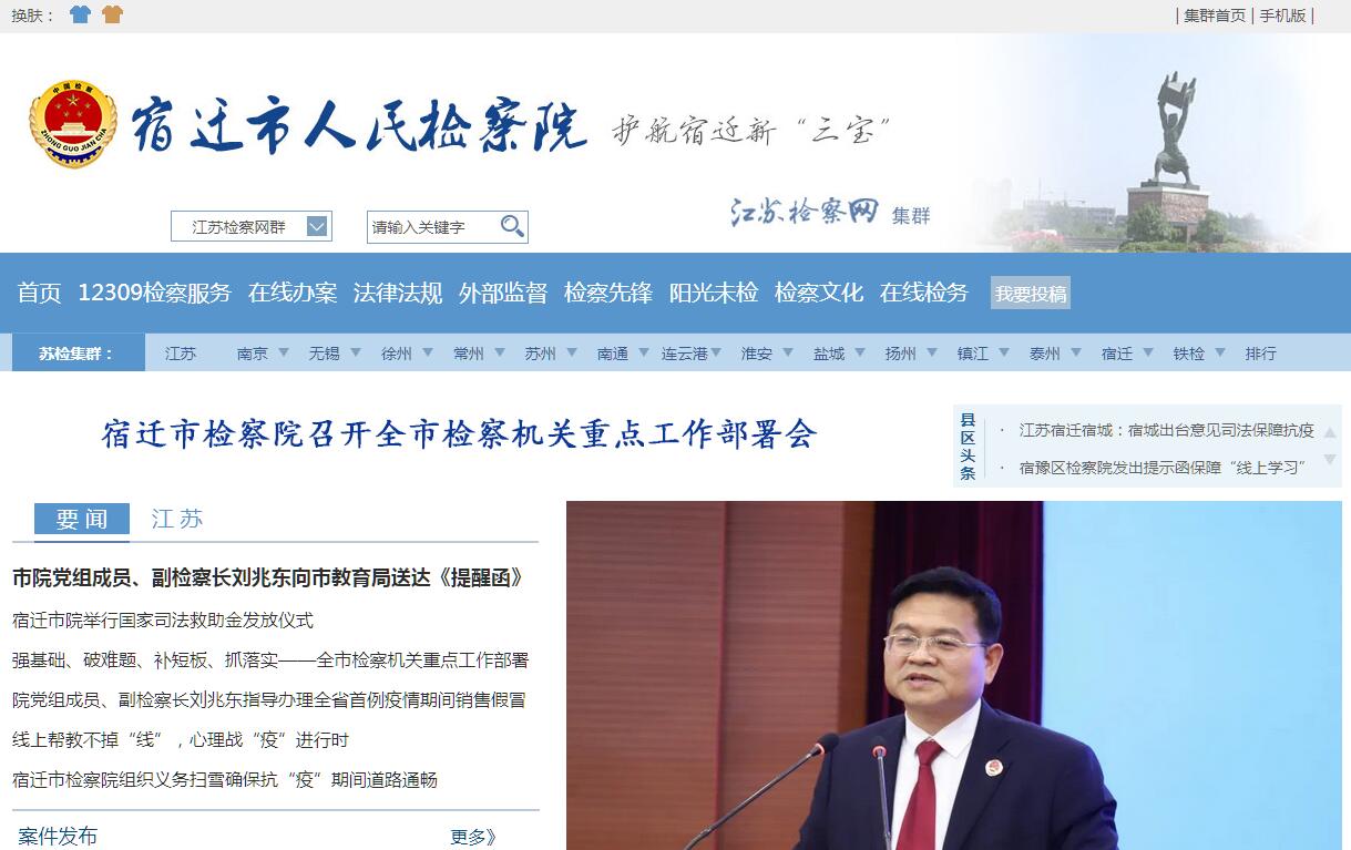 1996年12月26日,宿迁市人民检察院正式挂牌成立,辖沭阳、泗洪、泗阳、宿豫、宿城区五个县(区)院和派驻洪泽湖监狱的洪泽湖地区检察院,全市共有干警452人。2000年,坐落于市区洪泽湖路与世纪大道交会处,局部九层,总面积9300平方米的市院办公大楼投入使用。目前,市院现有在编干警89人。内设办公室、干部处、宣传教育处、侦查监督处、公诉处、反贪污贿赂局、渎职侵权检察处、监所检察处、民事行政检察处、控告申诉检察处、检察技术处、法律政策研究室、行政装备处、警务处。另按有关规定设纪检组、监察室(合署办公)。宿迁市人民检察院内设办公室、政策研究室、干部处、宣传教育处、监察处、案件管理处、机关党委、侦查监督处、公诉处、反贪污贿赂局、预防局、未检处、反渎职侵权局、刑事执行检察处、民事行政检察处、控告申诉检察处、技术处、行政装备处、警务处等19个部门。履行职务犯罪的侦查、审查批捕和决定逮捕、公诉、立案监督和侦查监督、审判监督、刑罚监督等6大检察职能。2012年以来,在市委、省检察院的领导和市人大及其常委会的监督下,在市政府的支持和市政协的民主监督及社会各界关心帮助下,全市检察机关深入贯彻落实党的十八大以及十八届三中、四中、五中、六中全会精神,紧紧围绕“四个全面”战略布局,全面履行检察职能,积极为推进“强富美高”全面小康新宿迁建设提供有力的司法保障。市检察院获评“全国文明单位”,下辖五家基层院均被评为“全省文明单位”。两级院先后荣获“全国反假货币工作先进集体”“全国检察机关文明接待室”“全国老年法律维权工作先进集体”等国家级荣誉称号14项。去年,两个院被评为“全省先进基层院”,其中沭阳县检察院被评为“全国先进基层院”。先后有85个集体123名个人获省级以上表彰。