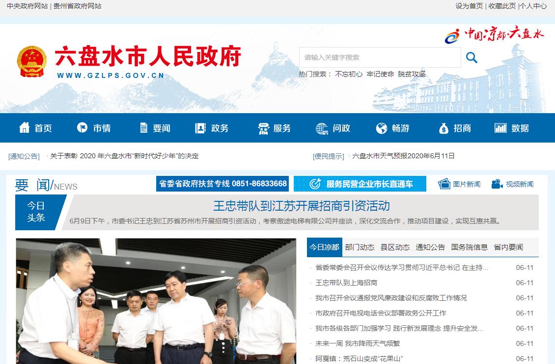 六盘水市位于贵州西部乌蒙山区,是国家“三线”建设时期发展起来的一座能源原材料工业城市,1978年12月18日经国务院批准建市。全市国土面积9914平方公里,辖六枝特区、盘州市、水城县、钟山区4个县级行政区和5个省级经济开发区,87个乡镇(街道)。2018年末全市户籍人口348.55万人,以彝族、苗族、布依族为代表的少数民族人口89.27万人,占总人口的25.61%。六盘水矿产资源富集。有煤、铁、锰、锌、玄武岩等矿产资源30余种,其中煤炭资源远景储量844亿吨,探明储量233.24亿吨,保有储量222.74亿吨,具有储量大、煤种全、品质优的特点,是全国“14个亿吨级大型煤炭基地”之“云贵基地”的重要组成部分,是长江以南最大的主焦煤基地,素有“江南煤都”之称;煤层气资源储量1.39万亿立方米,占全省的45%,在全国63个重要煤层气目标区中位列第十二位,是贵州毕水兴煤层气产业化基地的重要组成部分。六盘水作为国务院确定的全国20个成长型资源城市之一,现已形成以煤炭、电力、冶金、建材和新型煤化工为支柱的现代工业体系,境内拥有首钢水钢集团、盘江精煤公司、水矿控股集团、六枝工矿集团4户“三线”建设时期发展起来的国有大型企业。六盘水气候资源独特。境内最高海拔2900.6米,最低海拔586米,立体气候明显。冬无严寒、夏无酷暑,年平均气温15℃,夏季平均气温19.7℃,冬季平均气温3℃。气候凉爽、舒适、滋润、清新,紫外线辐射适中,被中国气象学会授予“中国凉都”称号,是全国唯一以气候特征命名的城市。六盘水旅游资源丰富。境内瀑布、溶洞、森林、峡谷、湖泊、温泉,比比皆是;山奇、水灵、谷美、石秀,处处成景,是名副其实的山地公园市。近年来,围绕全域旅游着力打造山地大健康旅游产品体系,建成牂牁江湖滨旅游度假区、野玉海国际山地旅游度假区、乌蒙大草原旅游景区、梅花山旅游景区等10余个重点旅游景区,其中国家4A级旅游景区10个、省级旅游度假区8个,还建成了玉舍滑雪场等4个中国纬度最低的滑雪场。六盘水生物资源多样。全市森林覆盖率为59%,境内种子植物162科614属1700余种,有红豆杉、银杏、珙桐、水杉等国家一级保护植物10种,有西康玉兰、香果树、鹅掌楸、十齿花、伞花木等国家二级保护植物15种,被誉为世界古银杏之乡、中国红豆杉之乡、中国野生猕猴桃之乡、中国野生刺梨之乡。境内有玉舍国家森林公园、贵州黄果树瀑布源国家森林公园、贵州水城国家杜鹃公园、牂牁江国家湿地公园、娘娘山国家湿地公园、明湖国家湿地公园。六盘水历史文化悠久。距今2亿至3亿年的二叠纪、三叠纪时期,板块运动、海洋抬升,留下丰富的古生物化石群。1993年考古发现距今20多万年的“盘县大洞人”,为贵州发现的最早智人,被评为当年全国十大考古发现之首。水城硝灰洞发现距今8万年的“水城人”,六枝桃花洞发现距今1万年的“桃花洞人”。春秋时期为牂牁国地,战国时期为夜郎国地,留下了神秘的古夜郎文化。红军长征期间红二六军团在盘县九间楼召开了“盘县会议”,留下了宝贵的长征文化。“三线”建设时期来自全国各地的十万大军与六盘水各族人民共同缔造了多元包容的“三线”文化。六盘水民族文化多彩。44个少数民族孕育了多姿多彩的民族民间文化,有盘县彝族山歌、盘县布依盘歌、六枝梭戛苗族蜡染技艺、水城南开苗族芦笙技巧等国家级非物质文化遗产,有彝族火把节、苗族跳花节、回族开斋节、仡佬族吃新节等丰富多样的节庆文化。建有亚洲第一座生态博物馆“六枝梭戛苗族风情生态博物馆”、中国第一个彝族文化园“海坪彝族文化园”、中国最大的布依族铜鼓“月亮河布依族铜鼓”。六盘水交通区位优越。地处川滇黔桂结合部,与成都、重庆、昆明、贵阳、南宁五个省会城市的直线距离均在500公里以内,素有“四省立交桥”之称。在国家“一带一路”建设和长江经济带规划中,六盘水是66个区域流通节点城市和196个公路交通枢纽城市之一。贵昆、南昆、内昆、水红铁路在此交汇,沪昆高速铁路和沪昆、杭瑞、都香、水盘、盘兴等高速公路穿境而过,六盘水月照机场开通了直达北京、广州、杭州、成都等十多个城市的航线。2019年,全市地区生产总值1265.97亿元,比上年增长7.5%;一般公共预算收入106.81亿元,比上年下降24.6%;规模以上工业增加值增长9.0%;固定资产投资比上年下降3.3%;城镇、农村居民人均可支配收入分别达到33048元和11043元,分别增长8.8%和10.8%。“三池三湖六盘水,千岩万壑一凉都”。当前,六盘水正处在决胜脱贫攻坚、同步全面小康的关键时期,我们将以习近平新时代中国特色社会主义思想为指导,深入贯彻党的十九大精神和习近平总书记在贵州省代表团的重要讲话精神,统筹推进“五位一体”总体布局,协调推进“四个全面”战略布局,坚持稳中求进工作总基调,贯彻落实五大发展理念,坚持实施主基调主战略,推进“三大战略行动”,守住“三条底线”,抓好“三件大事”,走好“四条新路”,弘扬“三线”精神,深化“三变”改革,牢记嘱托,感恩奋进,全面建设统筹城乡改革和发展先行市,奋力谱写百姓富、生态美的多彩贵州新未来的六盘水篇章。