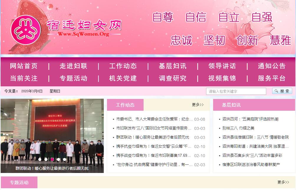 宿迁妇女网由宿迁市妇女联合会主办。1997年3月8日,宿迁市妇女第一次代表大会召开,地级宿迁市妇联成立。目前全市妇女组织网络健全,全市有县、区妇联5个,开发区妇联2个,乡镇妇联组织104个,村(居)妇代会1414个。在机关、教育、卫生、建设、公安、供电、交通等单位设立妇女工作委员会。团体会员有工会女职工委员会和以行业、界别成立的女领导干部联谊会、女企业家协会、妇女商会。2002年,市委办编制印发了宿办发〔2002〕75号《<宿迁市妇女联合会机关职能配置内设机构和人员编制规定>的通知》文件,对市妇联的职能配置、内设机构和人员编制,进行了明确规定。市妇联现设办公室、宣传部、权益部、事业发展部、组织部、儿童工作部等6个职能部门,市政府妇女儿童工作委员会办公室也设在市妇联。根据《中华全国妇女联合会章程》的规定,妇联的基本职能是代表和维护妇女权益,促进男女平等,发展妇女儿童事业。(即:团结、教育、代表、服务、联谊职能)几年来,市妇联领导班子在市委市政府的正确领导和省妇联的关心支持下,认真履行职能,紧紧抓住发展与维权两大主线,围绕中心、服务大局,团结带领全市妇女积极参与社会主义现代化建设,从打基础、上台阶到创特色,一步一个脚印,扎实开展工作,取得了显著成效。招商引资、扶贫及妇女劳动力转移工作多次受到市委、市政府和省妇联的表彰;组队参加各类省级比赛,多次获特等奖;“春蕾计划”实施工作为全省树立了标杆,已成为我市妇女儿童工作的品牌;“九五”期末,我市妇女儿童工作还获得了最高荣誉:受到国务院的表彰; 市妇联也先后于2002年、2006年被授予省、全国“三八红旗集体”荣誉称号。