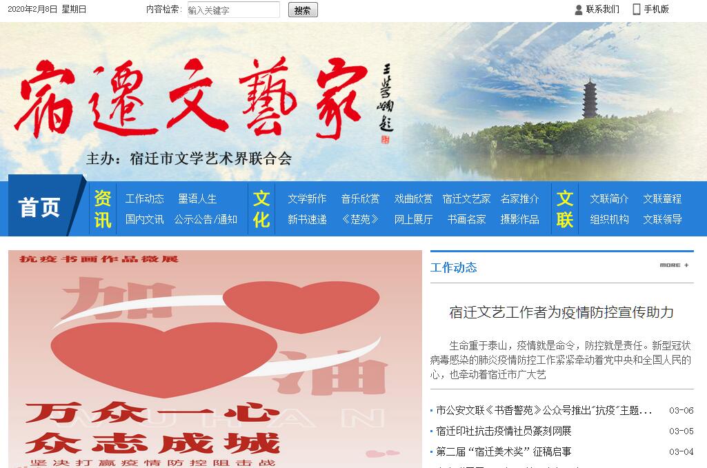 宿迁市文学艺术界联合会(简称宿迁市文联)是中共宿迁市委领导下的,由全市各文学艺术家协会,市辖各县区文学艺术界联合会,产(企)业文学艺术工作者联合会组成的人民团体,是党和政府联系文艺家的桥梁和纽带。主要履行对各团体会员“联络、协调、服务、指导”的职能。宿迁市文联成立于1997年3月,2016年10月设立市文联党组。宿迁市文联现任党组书记、主席仲向阳。宿迁市文联机关现分为行政和事业两块,其中,行政部分:内设组联部、协会部两个处室,编制5人,在职在岗7人(包括2名编外工作人员)。事业部分:2014年3月,成立宿迁市文学院,隶属于市文联,编制6人,在编6人。宿迁市文联现有团体会员为18个,其中县(区)文联和行业文联7个,包括沭阳县文联、泗阳县文联、泗洪县文联、宿城区文联、宿豫区文联、市公安文联、市检察院文联,市级文艺家协会11个,包括市作家协会、市书法家协会、市美术家协会、市摄影家协会、市音乐家协会、市舞蹈家协会、市戏剧曲艺家协会、市民间文艺家协会、市诗词协会、市电视艺术家协会市、市文艺评论家协会。近年来,宿迁市文联团结带领全市广大文艺工作者,在市委、市政府的领导下,在省文联和市委宣传部的指导下,克服基础薄、条件差、人手少、队伍散等诸多困难,以饱满的工作热情和良好的精神状态,凝心聚力,扬长避短,为江苏文化强省建设,繁荣宿迁文艺事业,做出了积极的贡献。文艺活动丰富多彩。2013年10月,成立了宿迁市文艺志愿者服务团,每年都组织10余场文艺志愿者惠民服务活动。从2014年起,每年组织一期全市文艺家读书班活动,邀请省内外著名文艺家和文艺界领导为我市文艺家授课,交流创作成果,开展有益的采风活动,拓宽了我市文艺家的视野,提升了他们的创作水平。宿迁市文联还主动作为,强化主导功能,牵头组织带领各文艺家协会举办全市性重大文艺活动,逐步形成权威性品牌,积极承办省一级的大型文艺活动,推动我市文艺事业发展繁荣。近年举办的大型活动有:2012年9月承办了苏北五市书画精品联展活动;2013年组织了第二十届全国文艺推新人大赛宿迁赛区活动;2014年承办了为期10天的江苏省基层作家读书班活动;承办了江苏省第五次美术新人展;开展了中国梦、我的梦“大美宿迁”摄影艺术展;主办了第三届苏北五市摄影作品联展;2015年在江苏省现代美术馆成功举办了“视觉宿迁”宿迁市书法美术摄影精品展;举办了“翰墨西楚﹒宿迁市第八届书法篆刻展”;开展了宿迁市第五届摄影艺术活动展;2016年举办了建市二十周年大型摄影图片展,江苏省第十届新人书法篆刻展,等等。通过举办这些活动,为我市文艺家提供了广阔的平台,培养了人才,激发了他们的创造力,推动了宿迁文艺事业的繁荣发展。文艺精品层出不断。2012年,青年书法家朱志刚荣获兰亭奖佳作奖;杜怀超《一个人的家具史》荣获全国孙犁散文奖一等奖。2013年,胡继风的小说《鸟背上的故乡》一举获得第九届全国优秀儿童文学奖第一名;郑奇恩作词、潘新文作曲的《短信》获省“五个一工程奖”。2014年,有长篇小说《麦田云雀》等16部文学图书公开出版发行。2015年,出版图书《牛自力》、《笔端文心》、《书法微言》、《三年间》、等多部图书,创作《从新起点出发》、《中国梦•中国红》等多首歌曲。书法、美术、摄影、戏曲等的文艺创作丰富多彩,孙冲、提俊丰、赵立志等书法家作品入全国书法展,其中孙冲同志荣获优秀奖;张劲扬同志的油画作品《三台人家》入展“金陵百家”全国美展;董金良的《一直》获江苏美术奖;王玉等人的《戏梦》获得第三十一届金凤凰奖;刘汉飞同志的鼓曲说唱《项羽与虞姬》获得第六届江苏省曲艺芦花奖。文艺人才队伍不断壮大。以发展各个层次的文艺家会员为抓手,以各协会国家级会员为基本力量,建立百名中青文艺家人才库,给予重点扶持,着力打造文艺家骨干力量,以省以上表彰奖励和晋升学习为契机,努力推荐文艺领军人才脱颖而出。宿迁市摄影家协会主席陆启辉同志在江苏省摄影家协会换届中当选为最年轻的副主席,宿迁市书法家协会主席张守跃同志被评为全省德艺双馨文艺家;江苏省青年文艺家协会副秘书长孙冲和宿迁市作家协会副主席胡继风先后成为全省宣传文化系统五个一批人才。在他们的带动下,宿迁市繁荣文艺的主力军逐渐形成。截止2016年底,各文艺家协会共有市级以上会员2499名,其中省级会员850名,国家级会员222名。