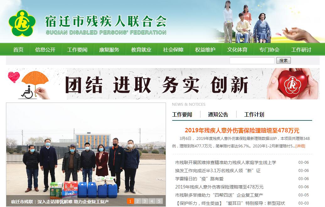宿迁市残疾人联合会(简称宿迁市残联)是经市政府批准的由残疾人及其亲友和残疾人工作者组成的人民团体。服务宗旨是:弘扬人道主义思想,发展残疾人事业,促进残疾人平等、充分参与社会生活,共享社会物质文化成果。具有“代表、服务、管理”三种职能:代表残疾人共同利益,维护残疾人合法权益;团结教育残疾人,为残疾人服务;履行法律赋予的职责,承担政府委托的任务,管理和发展残疾人事业。主要职责是:1. 宣传贯彻《中华人民共和国残疾人保障法》,维护残疾人在政治、经济、文化、社会等方面平等的公民权利,密切联系残疾人,听取残疾人意见,反映残疾人需求,全心全意为残疾人服务。2. 团结、教育残疾人遵守法律,履行应尽义务,自尊、自信、自强、自立,为构建和谐社会、全面建设小康社会贡献力量。3. 推进残疾人“两个体系”建设,开展和促进残疾人康复、教育、扶贫、劳动就业、维权、托养、文化体育、社会保障和残疾预防等工作,改善残疾人参与社会生活的环境和条件。4. 配合有关部门起草有关发展残疾人事业的规范性文件;协助政府研究制定我市残疾人事业发展规划、计划;发挥综合、协调、咨询、服务作用。5. 承担政府残疾人工作委员会的日常工作。6. 管理和发放《中华人民共和国残疾人证》。7. 管理和指导各类残疾人群众组织,培养残疾人工作者,使残疾人在残疾人组织中更加活跃,残疾人组织在基层更加活跃,残疾人和残疾人组织在社会上更加活跃。8. 开展对外交流与合作。