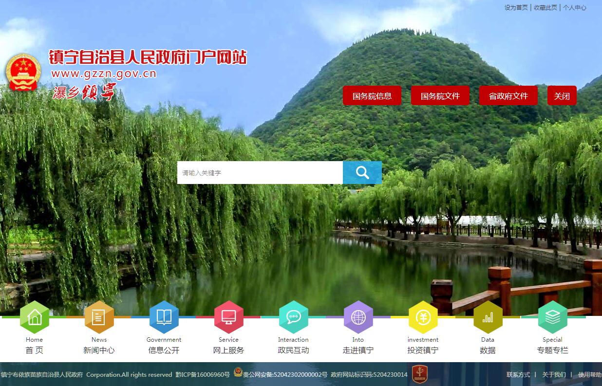 镇宁布依族苗族自治县隶属贵州省安顺市,位于贵州省西南部珠江水系与长江水系分水岭之间。地处东经105。35’~106。01’,北纬25。25~26。11之间,东邻西秀区、紫云县,北靠普定县、六枝特区,南连贞丰、望谟二县,西接关岭县。全县土地面积l 717. 3平万千米,辖5个街道、8个镇、3个乡,总人口41.2万人(2019年),境内长期居住着汉族、布依族、苗族、仡佬族等23 个民族。本县处于分水岭向深切河谷演化的斜坡地带,地势北高南低,主要表现为低中山、低山,丘陵及河谷盆地。境内最高点在东北部革利乡县界上岩窝坡,海拔高程1678米;最低点在南部良田乡北盘江出县界处,海拔高程356米。气候属亚热带季风湿润区,年平均气温14.4℃,年平均降水量1 025 6毫米。全年无霜期为270天,河流属珠江水系,绝大部分河流由北向南汇入北盘江,由于河流水力坡降大,蕴藏着丰富的水力资源,黄果树瀑布就是其中最大者。镇宁是贵州西线旅游中心,王要是山、洞、水“三奇”为特色的自然风光,景观独具一格,素有“风景县”之誉,境内有国家级风景名胜区和国家5A级景区黄果树瀑布、龙宫,国家级非物质文化遗产镇宁铜鼓十二调,还有犀牛洞、观音洞以及名扬海外的民族风情腊染、织锦,以及夜郎洞天、高荡、牙礁石林、孟获屯、官寨白骨塔等景区,同时黄果树还是中国自然文化遗产。县政府所在地距省会贵阳市118公里,距安顺市25公里,距黄果树机场20公里.距沪昆高铁安顺西21公里。镇宁自古以来就有“黔滇锁匙”乏称,沪昆、六镇、惠兴三条高速公路横贯南北,拥有8个高速公路出入口,能快速通达各交通要线。境内油路乡乡通,村村通硬化路。贵昆铁路穿境而过,位于珠江水系上游的坝草码头通江达海。2019年,全县实现地区生产总值109.62亿元,增长7.5%;规模以上工业增加值增长10.8%;社会消费品零售总额增长5.7%;财政总收入5.62亿元,一般公共预算收入3.24亿元;金融机构人民币存贷款余额分别达92.38亿元和139.47亿元;城镇和农村常住居民人均可支配收入达30493元和9704元,增长8.5%和10%。