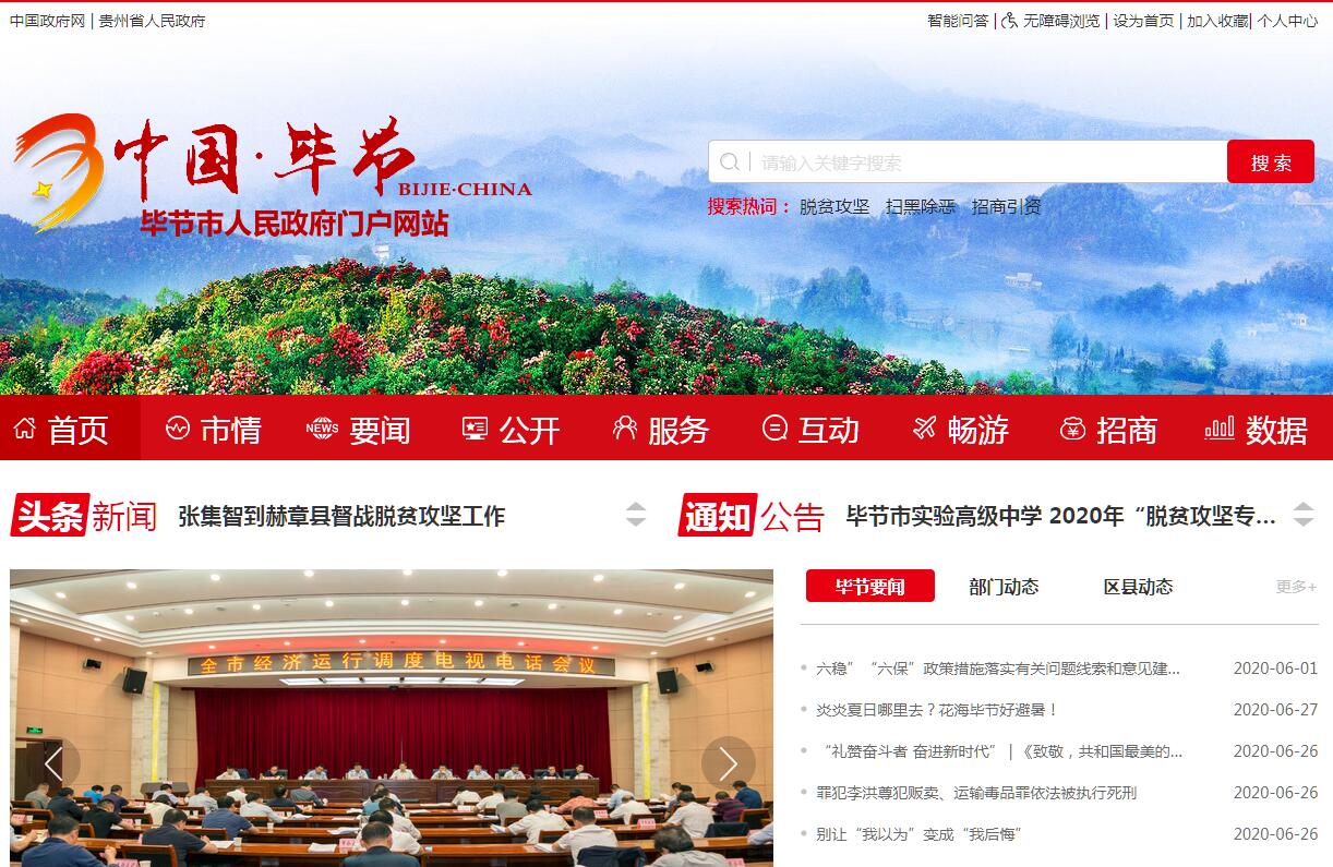 毕节市位于省的西北部、川滇黔三省交界、乌蒙山腹地,总面积2.69万平方公里。辖七星关区、大方县、黔西县、金沙县、织金县、纳雍县、威宁彝族回族苗族自治县、赫章县8个县(区、自治县)和百里杜鹃管理区、金海湖新区2个正县级管委会,278个乡(镇、街道),3701个村(居),居住着汉、彝、苗、回等46个民族。2019年末,全市常住人口671.43万人,户籍人口937.76万人。毕节,国家“西电东送”的重要能源基地,国家新型能源化工基地,国家新能源汽车高新技术产业化基地,国家生物医药产业基地,现代山地高效生态农业、新能源、新型建材、以大数据为核心的服务外包和呼叫中心等多种新兴产业的集聚地,全国唯一一个以“开发扶贫、生态建设”为主题的试验区。毕节,川、滇、黔、渝结合部区域性中心城市,西南地区区域性重要综合交通枢纽,珠三角连接西南地区、长三角连接东盟地区的重要通道。毕节,矿产资源储量巨大,已探明矿产60多种,磷矿储量名列全国前茅,煤炭远景储量居于长江以南之冠,铁矿、铜矿、铅矿、稀土矿储量处在贵州第一;生物资源多样,动植物资源2800多种,有全国、全省如马铃薯之乡、白蒜之乡等众多“地理标志”;水能资源丰富,河湖水系纵横交错,流域面积100平方公里以上的河流有80条。毕节是古夜郎政治经济文化中心之一,中国南方古人类文化发祥地。毕节风光景色旖旎,被誉为“洞天湖地、花海鹤乡、避暑天堂”;毕节气候清凉宜人,是避暑旅游城市观测点。毕节是三省红都,长江以南最后一块革命根据地,厚重历史文化,在全国都具有唯一性。2019年,全市完成地区生产总值1901.36亿元,增长8.0%,固定资产投资增长0.9%,规模以上工业增加值增长5.3%,社会消费品零售总额增长6.3%;城镇常住居民人均可支配收入32638元、增长9.2%,农村常住居民人均可支配收入10364元、增长10.8%。
