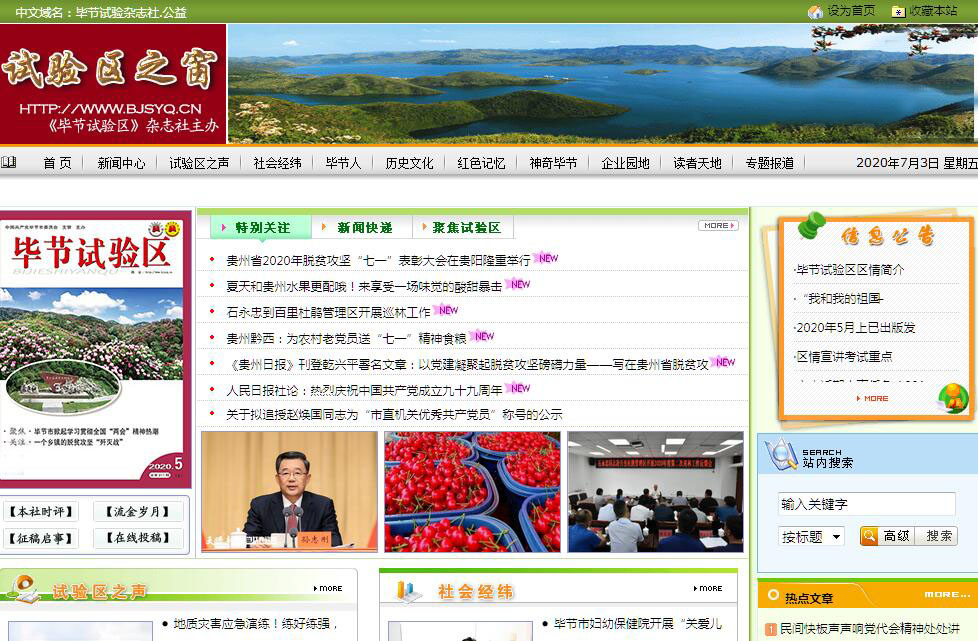 | 网站简介: 《试验区之窗》是由《毕节试验区》杂志社主办的一家综合性、地区性新闻网站,以全方位、深层次报道“毕节地区开发扶贫、生态建设试验区”为己任。网站设有新闻中心、试验区之声、社会经纬、明星村镇、毕节人、历史文化、红色记忆、神奇毕节、企业园地等栏目。通过对毕节试验区建设及发展进行动态报道,展示试验区建设的成就,为广大网民读都提供关于毕节试验区的详细信息及资料。 |