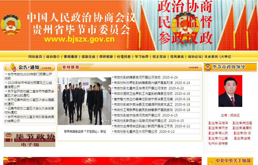 | 网站简介: 毕节地区辖1个市和7个县,即毕节市、赫章县、威宁彝族回族苗族自治县、纳雍县、织金县、大方县、黔西县、金沙县。1951年1月23~30日,毕节专区各族各界人民代表会议在毕节召开,选举产生了毕节专区各族各界人民代表会议协商委员会,选出主席1名、副主席1名,委员32名。1985年2月27日,经贵州省政协第五届委员会常务委员会第十一次会议的决定,设立政协贵州省委员会毕节地区联络处。1989年1月13日政协贵州省第六届委员会常务委员会第五次会议决定,将省政协毕节地区联络处改为政协贵州省委员会毕节地区工作委员会。 |