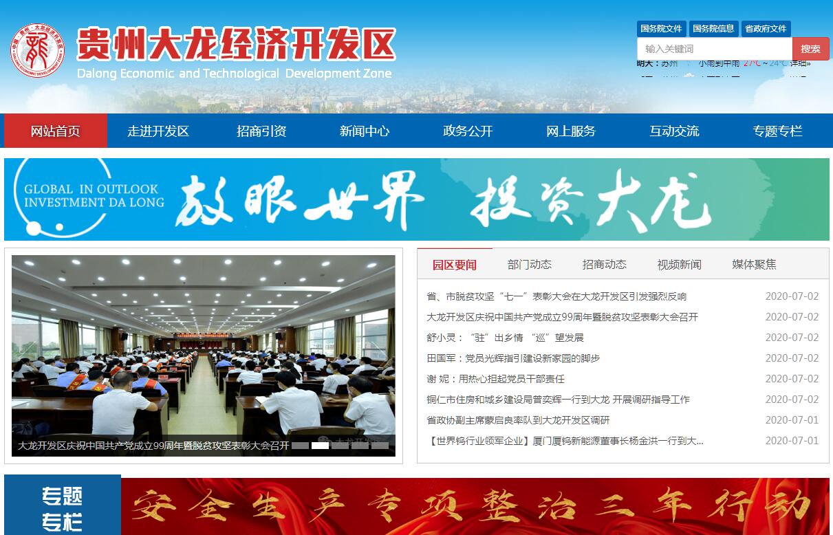 贵州大龙经济开发区成立于1992年,1999年经省政府批准升格为省级经济开发区,2012年12月省政府明确为市(州)直管的省级经济开发区。大龙开发区辖1个镇、1个社区服务管理局、19个行政村、4个居委会(另拟筹建7个跨区域易地扶贫搬迁新区居委会),总人口61689人,其他常住人口12411人。起步区规划15km2、核心区规划35km2、拓展区规划53km2,远景规划面积106km2。大龙开发区地处“黔东门户”,湘黔铁路、株六复线、沪昆高铁、铜仁城际高铁、沪昆高速、铜大高速、江玉高速、石玉高速、玉屏-铜仁-松桃城市快速干道、梵净山城市干道贯穿全境,距离铜仁凤凰机场、湖南芷江机场仅1小时车程。区位优越,交通便利。大龙开发区是黔委厅字〔2012〕2号文件确定的贵州“东联”发展战略的桥头堡和西部大开发的前沿阵地,黔党发〔2013〕10号文件明确打造的万山转型产业基地,是湘黔高铁经济带的重要节点,铜仁黔东工业聚集区核心区,黔东工业聚集区的“火车头”、铜仁工业经济发展的“顶梁柱”和贵州内陆开放要地的“桥头堡”。当前,正在按照“千方百计聚产业,一心一意聚人气,竭尽全力强基础,齐心协力奔小康”的思路和“建设平安大龙、和谐大龙、幸福大龙”的理念,奋力争创国家级开发区,打造千亿级园区,建设生态文明工业新城,力争到2020年成功创建国家级开发区,到2025年工业产值实现1000亿元,到2032年建成30万人口生态文明工业新城。近年来,大龙开发区先后成功创建国家级循环化改造示范试点园区,国家级新型工业化示范基地,省级新型工业化示范基地,省级外贸转型升级示范基地,省级清洁生产试点示范园区,省级综合型生产性服务业聚集区,省级返乡农民工创业示范园,省级生态示范镇,成为全省首批培育的千亿级开发区和重点优先支持申报国家级开发区单位。2014-2016年连续三年位居全省产业园区(开发区)综合考评全省省级开发区第一,2017年位居第二。2014-2017年连续五年位居全省省级示范小城镇综合考评全省前列。近年来,大龙开发区积极发展实体经济,形成了以新能源新材料产业、劳动密集型轻工产业为主导的产业发展格局。目前,开发区共有工商注册企业661户,其中工业企业268家,规模以上工业企业64家。2017年,实现规模以上工业总产值158.75亿元,规模以上工业增加值33.25亿元,固定资产投资61.18亿元,财政总收入5.02亿元。