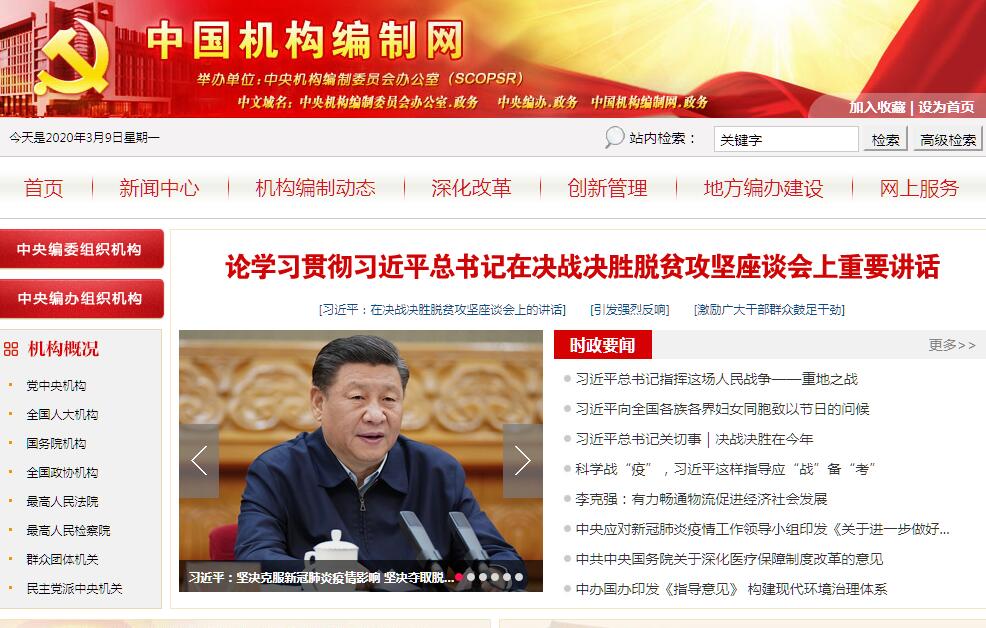 中国机构编制网由中央机构编制委员会办公室主办。中央机构编制委员会办公室(State Commission Office of Public Sectors Reform,简称SCOPSR)是中央机构编制委员会的常设正部级办事机构,在中央机构编制委员会领导下负责全国行政管理体制和机构改革以及机构编制的日常管理工作。既是党中央的机构,又是国务院的机构。中央机构编制委员会办公室是中央机构编制委员会的常设办事机构。中央机构编制委员会办公室主要职责是:(一)研究拟订行政管理体制和机构改革以及机构编制管理的政策和法规。统一管理各级党政机关,人大、政协、法院、检察院机关,各民主党派、人民团体机关的机构编制工作。(二)研究拟订行政管理体制与机构改革的总体方案,审核党中央各部门、国务院各部门和省级机构改革方案,指导、协调地方各级行政管理体制和机构改革以及机构编制管理工作。(三)协调党中央各部门、国务院各部门的职能配置及其调整,协调党中央各部门之间、国务院各部门之间、党中央各部门和国务院各部门之间以及各部门与地方之间的职责分工。(四)审核党中央各部门、国务院各部门、垂直管理部门、派驻地方机构、驻外使领馆的内设机构、人员编制和领导职数;审核省级党委政府厅局机构设置、省级党政群机关人员编制、口岸查验单位机构编制和全国市县机构编制分类、省以下各级党政群机关的人员编制总额。(五)审核全国人大、全国政协机关及最高人民法院、最高人民检察院机关,各民主党派、人民团体机关的机构设置、人员编制和领导职数。(六)研究拟订全国事业单位管理体制和机构改革的方案;审核党中央、国务院直属事业单位的机构编制方案;审批党中央、国务院各部门所属事业单位的机构编制;负责事业机构编制管理方面的其他重要事项;指导并协调地方事业单位管理体制改革和机构编制管理工作;负责全国事业单位登记管理工作。(七)监督检查各级行政管理体制和机构改革以及机构编制的执行情况,报告中央编委并上报党中央、国务院。(八)完成党中央、国务院和中央机构编制委员会交办的其它工作任务。