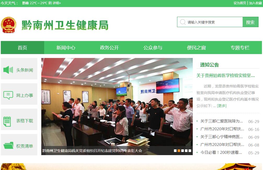 | 网站简介: 2019年1月,根据省委批准的《黔南州机构改革方案》和我州实施意见,将州卫生和计划生育委员会、州深化医药卫生改革领导小组办公室、州老龄工作委员会办公室的职责,以及州安全生产监督管理局的职业安全健康监督管理职责整合,组建州卫生健康局,作为州政府工作部门。州老龄委的日常工作由州卫生健康局承担。不再保留州深化医药卫生改革领导小组办公室和州老龄工作委员会办公室。 |