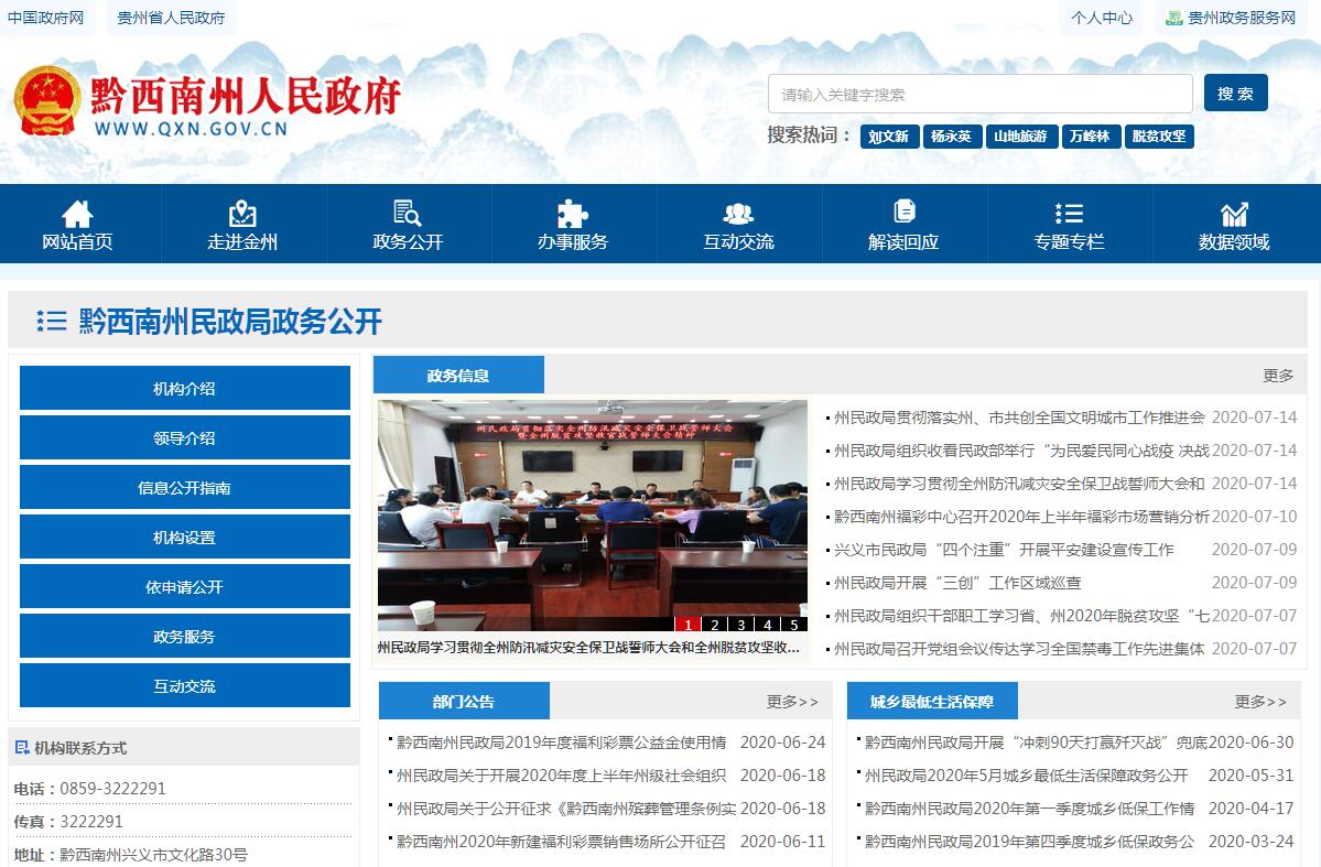 黔西南州民政局主要职责:(一)拟定全州民政事业发展规划、年度计划及政策并组织实施。负责州级民政事业经费管理工作;指导、监督全州各项民政事业经费管理工作。(二)组织实施社会团体、社会服务机构等社会组织登记和监督管理具体办法措施,依法对社会组织进行登记管理和执法监督。(三)负责全州城乡居民最低生活保障、特困人员救助供养、临时救助工作。指导全州城市低收入家庭收入核定和农村社会救助对象认定工作。(四)制定全州社会救助事业发展战略,编制社会救助事业中长期发展规划;指导全州建立健全和完善社会保障体系建设,建立社会救助联系会议制度。(五)拟定全州城乡基层群众自治建设和社区治理政策措施,指导城乡基层群众自治组织建设、城乡社区建设和社区服务体系建设;提出加强和改进城乡基层政权建设的建议,推动基层民主政治建设。(六)负责全州乡(镇)行政区划的设立、撤销、命名、更名、隶属关系变更、政府驻地迁移和行政区域变更的审核报批工作;指导全州地名管理工作;负责县级行政区域界线的勘定和管理工作;协调州内和省际行政区域界线争议调处工作。(七)负责婚姻登记管理,指导全州婚姻登记管理,推进婚俗改革;对婚姻登记管理人员进行业务培训。(八)负责殡葬管理,指导全州各地推进殡葬改革、丧俗改革,制定本地惠民殡葬政策措施、殡葬改革规划及指导意见。(九)负责统筹推进、督促指导、监督管理全州养老服务工作,拟定全州养老服务体系建设规划、政策、标准并组织实施。(十)统筹推进全州残疾人福利制度建设,负责特殊困难老年人救助工作。(十一)拟定全州儿童福利、孤弃儿童保障、儿童收养、孤残儿童康复、儿童救助保护政策和标准,督促指导农村留守儿童关爱服务和困境儿童保障工作。(十二)对城市生活无着的流浪乞讨人员实行救助,保障其基本生活权益,完善社会救助制度,并对救助站进行指导、监督。(十三)促进全州慈善事业发展,组织指导社会捐助工作,负责福利管理工作。(十四)负责社会工作、志愿服务登记备案,会同有关部门推进社会工作人才队伍和志愿队伍建设。(十五)结合本部门职责,做好军民融合、扶贫开发等相关工作;负责本部门、本行业领域安全生产和消防安全工作;积极推动民政领域“放管服”改革。(十六)完成州委、州政府及上级民政部门交办的其他任务。