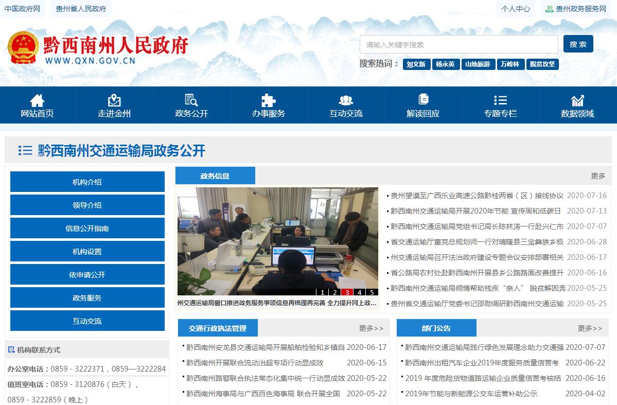 黔西南州交通运输局主要职责:(一)贯彻执行国家、省有关交通运输(交通战备)的法律、法规、规章、政策、行业规划和标准;指导交通运输业机制体制改革工作;起草交通运输业(交通战备)地方性法规、规章草案,执行公路、水路、交通运输业(交通战备)发展规划、中长期规划和年度计划并监督实施;指导综合交通运输枢纽规划和管理;参与拟订其他交通运输和物流业发展战略和规划,培育和规范物流运输市场;负责公路、水路交通运输业统计、环境保护和节能减排工作。(二)承担道路、水路运输市场监管责任,执行道路、水路运输相关政策、准入制度、技术标准和运营规范并监督实施;负责提出州内公路、水路固定资产投资规模和方向、省和州级财政性资金安排建议,按规定权限审批、核准年度计划规模内固定资产投资项目。(三)承担培育和管理交通运输市场,维护公路、水路交通运输业的公平竞争秩序;指导城乡客运有关设施规划和管理以及城市公共交通(城市公共汽车和巡游出租车、网约出租车)管理工作;指导汽车维修市场、汽车驾驶员培训以及汽车综合性能检测的行业管理;引导交通运输业优化结构和协调发展。(四)指导交通运输综合执法和队伍建设有关工作,依法开展全州公路路政、道路运政、水路运政、航道行政、港口行政、地方海事行政、工程质量管理等执法工作。(五)负责道路、水路交通运输业管理工作,承担道路运输业、城市客运、运政、水路运输和港口、航道的行政管理、行政审批、行政许可、行政裁决等工作;组织协调国家重点物资和紧急客货运输,承担交通运输通讯、信息工作。(六)承担交通战备职责。提出本地区国防交通路网布局建议和规划;拟定本地区国防交通保障计划,组织协调本地国防运输工作;承担州内军事行动交通运输保障、组织本地区国防交通队伍保障工作;负责民用运力国防动员和国防交通物资储备与调动相关工作:指导监督全州国防交通行政执法工作。(七)承担公路、水路建设市场监管责任。负责公路、水路交通基础设施的建设、维护、技术、质量与安全监督和造价管理以及施工许可、信用评价,协调配合国家重点公路(高速公路,一二级路,特大、大型桥梁、隧道)及水路交通工程建设,监督交通基础设施建设资金的使用。(八)负责对全州农村公路(含新增国省干道)的路政执法进行行业指导和技术业务指导。指导全州所辖农村公路路政管理,农村公路行政执法、农村公路巡查、农村公路超限运输管理,依法保护农村公路产权和维护农村公路的正常秩序。承担本地区跨县(市)超限运输车辆行驶农村公路的审批。(九)负责本地区重点公路、农村公路及大中型桥梁、隧道建设方案、初步设计和施工图设计审批以及权限内的招投标监督检查;负责交通运输从业单位信誉评价工作。(十)承担本级公路水路交通安全和交通运输业安全生产以及消防安全、平安交通监督管理工作;统筹交通运输安全生产标准化建设;负责船舶及水上设施检验、通讯导航、水上消防、水上交通及船舶污染事故应急救援、危化品运输,防止船舶、航道、港口污染及岸线管理等工作,归口管理船员培训考核、船舶建造质量安全监督;承担渔船检验和监督管理工作。(十一)承担全州交通运输行业科技、信息化、智慧交通发展战略。规划、政策、标准等并组织实施;承担交通运输业信息化、大数据应用、政务数据资源管理、技术标准和计量管理工作;推广交通科技新技术、新产品,推动行业科技进步。(十二)结合部门职责,做好军民融合、扶贫开发、“放管服”改革等相关工作;加大科技投入、提高科技创新能力,为推进创新驱动发展提供保障;按规定做好大数据发展应用和政务数据资源管理相关工作,依法促进部门政务数据资源规范管理、共享和开放。(十三)有关职责分工。由州交通运输局牵头,会同铁路、民航、邮政等部门建立综合运输体系协调配合机制。(十四)承办州委、州人民政府和省交通运输厅交办的其他事项。(十五)职责调整。1.划入州人民防空办公室(州交通战备办公室)交通战备职责;2.划入原州农委的渔船检验和监督管理职责;3.将所属事业单位承担的行政职能收回机关。(十六)职能转变。加快推进综合交通运输体系建设,完善综合运输服务衔接机制。优化交通服务方式,统筹城乡交通运输协调发展。强化交通运输管理,推动交通运输转型升级。加强交通安全生产责任制落实,统筹推进交通运输信用体系建设。(十七)承办州人民政府和省交通运输厅交办的其他事项。