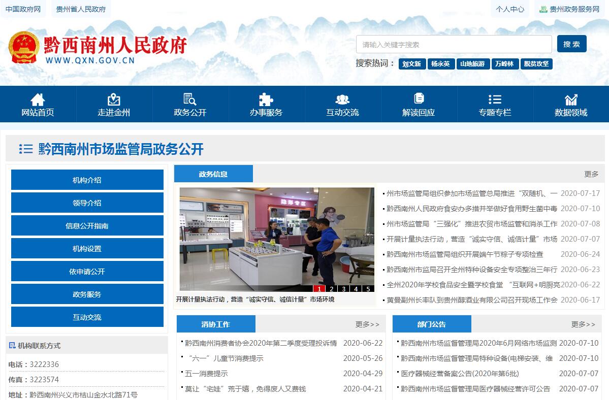 黔西南州市场监督管理局(州知识产权局)主要职责:(一)负责市场综合监督管理。贯彻执行国家和省州市场监督管理、知识产权有关法律法规、地方性法规、规章和政策,组织实施质量强州战略、知识产权强州战略、食品药品安全战略和标准化战略,拟订并组织实施有关规划,规范和维护市场秩序,营造诚实守信、公平竞争的市场环境。(二)负责市场主体统一登记注册。指导各类企业、农民专业合作社和从事经营活动的单位、个体工商户以及外国(地区)企业常驻代表机构等市场主体的登记注册工作。建立市场主体信息公示和共享机制,依法公示和共享有关信息,加强信用监管,推动市场主体信用体系建设。(三)指导和推动扶持微型企业发展政策措施的落实。承担州扶持微型企业发展工作领导小组办公室日常工作。(四)负责组织和指导市场监管综合执法工作。指导县(市、新区)市场监管综合执法队伍建设,推动实行统一的市场监管。组织协调重大复杂案件查处和跨区域执法工作。规范市场监管、知识产权行政执法行为。(五)按权限负责反垄断统一执法。统筹推进竞争政策实施,指导和推动公平竞争审查制度落实。按权限对经营者集中行为进行反垄断审查,依法依授权负责垄断协议、滥用市场支配地位和滥用行政权力排除、限制竞争等反垄断执法工作。(六)负责监督管理市场秩序。依法监督管理市场交易、网络商品交易及有关服务的行为。指导查处价格收费违法违规、不正当竞争、违法直销、传销、侵犯商标专利知识产权和制售假冒伪劣等行为。指导广告业发展,监督管理广告活动。指导查处无照生产经营和相关无证生产经营行为。指导黔西南州消费者协会开展消费维权工作。承担州打击传销规范直销工作联席会议办公室日常工作。(七)负责宏观质量管理。拟订并组织实施质量发展的制度措施。统筹全州质量基础设施建设与应用,会同有关部门组织实施重大工程设备质量监理制度,组织重大质量事故调查,实施缺陷产品召回制度,监督管理产品防伪工作。承担黔西南州质量发展领导小组办公室日常工作。(八)负责产品质量安全监督管理。管理产品质量安全风险监控、州级监督抽查工作。组织实施质量分级制度、质量安全追溯制度。指导工业产品生产许可管理。负责纤维质量监督工作。(九)负责特种设备安全监督管理。综合管理特种设备安全监察、监督工作,监督检查高耗能特种设备节能标准和锅炉环境保护标准的执行情况。(十)负责食品安全监督管理综合协调。组织制定全州食品安全重大政策并组织实施。负责食品安全应急体系建设,组织指导重大食品安全事件应急处置和调查处理工作。建立健全食品安全重要信息直报制度。承担州政府食品安全委员会办公室日常工作。(十一)负责食品安全监督管理。建立覆盖食品生产、流通、消费全过程的监督检查制度和隐患排查治理机制并组织实施,防范区域性、系统性食品安全风险。推动建立食品生产经营者落实主体责任的机制,健全食品安全追溯体系。组织开展食品安全监督抽检、风险监测、核查处置和风险预警、风险交流等工作。组织实施特殊食品监督管理。(十二)负责统一管理计量工作。推行法定计量单位和国家计量制度,管理计量器具及量值传递和比对工作。规范、监督商品量和市场计量行为。(十三)负责统一管理标准化工作。依法组织拟订州级地方标准,协调指导和监督县级地方标准、团体标准、企业标准制定工作。组织参与制定国际标准、国家标准和省级地方标准工作,组织采用国际标准;承担州级专业标准化技术委员会管理工作。(十四)负责统一管理检验检测工作。推进检验检测机构改革,规范检验检测市场,完善检验检测体系,指导协调检验检测行业发展。(十五)负责统一管理、监督和综合协调认证认可工作。组织实施国家统一的认证认可和合格评定监督管理制度。(十六)负责拟订和组织实施知识产权强州建设的政策措施和发展规划。推进知识产权创造、保护和运用的管理政策和制度的落实。推进知识产权公共服务体系建设,组织开展商标、专利等知识产权信息的传播利用。承担州人民政府知识产权办公会议制度办公室日常工作。(十七)负责保护知识产权。组织实施保护商标、专利、原产地地理标志等知识产权制度。研究鼓励新领域、新业态、新模式创新的知识产权保护、管理和服务政策。组织实施知识产权保护体系建设方案,推动知识产权保护体系建设。负责指导商标、专利注册和执法工作,指导知识产权争议处理、维权援助和纠纷调处。(十八)负责促进知识产权运用。拟订知识产权运用和规范交易的政策,促进知识产权转移转化。推进重大经济活动知识产权评议、对外转让相关工作。指导知识产权无形资产评估工作。促进知识产权服务业发展。统筹协调重大知识产权活动相关工作。(十九)负责市场监督管理科技和信息化建设、新闻宣传、应急处置、舆情监测。按规定承担技术性贸易措施有关工作。(二十)负责药品(含中药、民族药,下同)、医疗器械和化妆品流通、使用环节安全监督管理。组织起草地方性法规、规章草案,拟订监督管理政策规划,并监督实施;组织实施鼓励药品、医疗器械和化妆品新技术新产品的管理与服务政策。(二十一)负责药品、医疗器械和